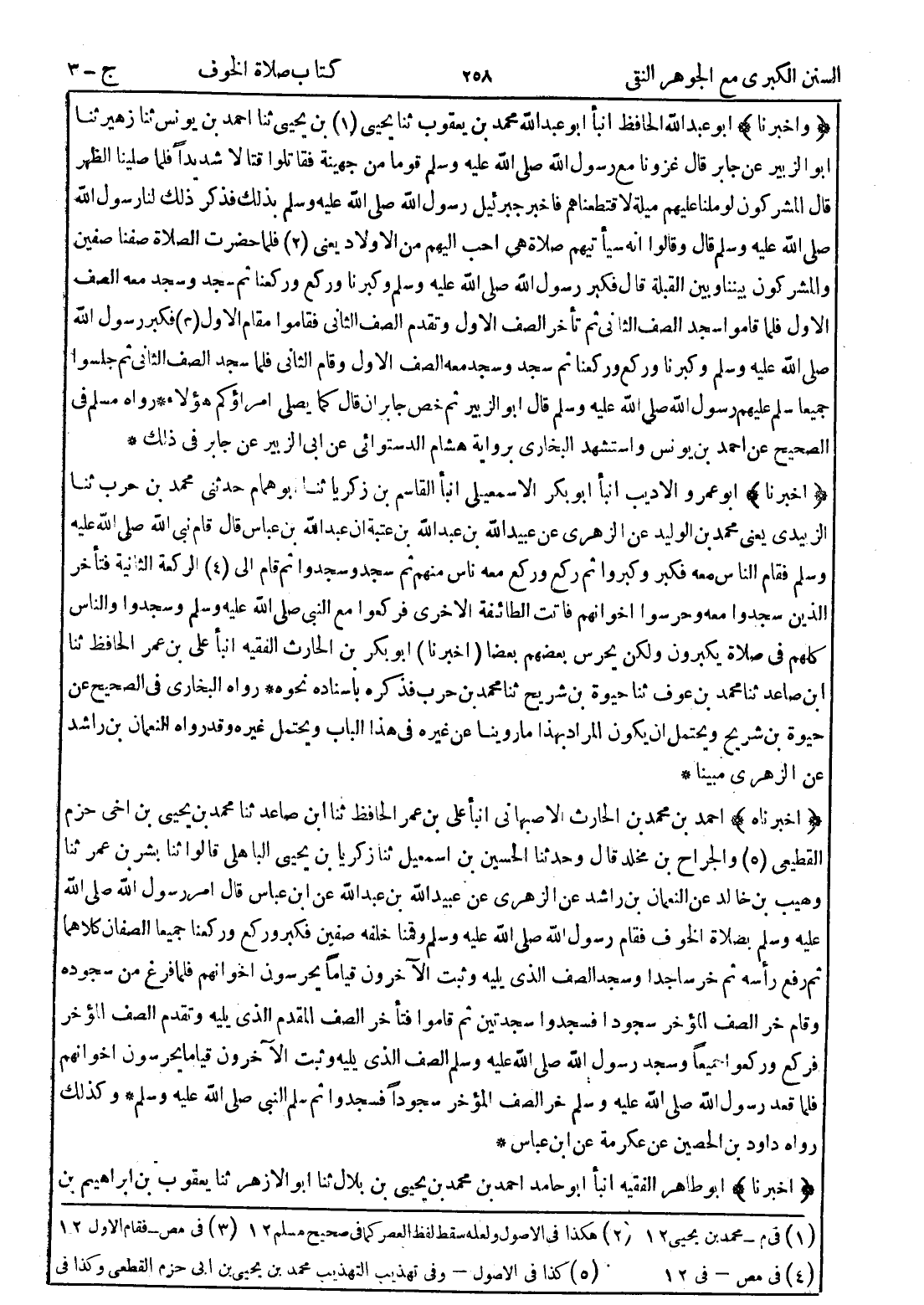 (أخبرنا) أبو عمرو الاديب انبأ أبو بكر الاسمعيلي انبأ القاسم بن زكريا ثنا أبو همام حدثني محمد بن حرب ثنا الزبيدي يعني محمد بن الوليد عن الزهري عن عبيد الله بن عبد الله بن عتبة ان عبد الله بن عباس قال قام نبي الله صلى الله عليه وسلم فقام الناس معه فكبر وكبروا ثم ركع وركع معه ناس منهم ثم سجد وسجدوا ثم قام إلى (4) الركعة الثانية فتأخر الذين سجدوا معه وحرسوا اخوانهم فاتت الطائفة الاخرى فركعوا مع النبي صلى الله عليه وسلم وسجدوا والناس كلهم في صلاة يكبرون ولكن يحرس بعضهم بعضا