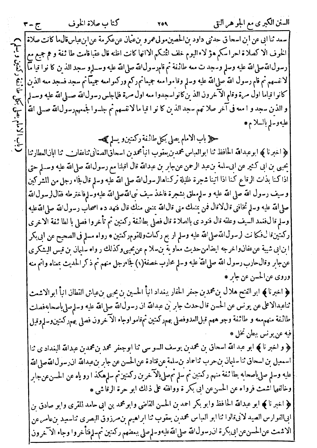 (أخبرنا) أبو الفتح هلال بن محمد بن جعفر الحفار ببغداد انبأ الحسين بن يحيى بن عياش القطان انبأ أبو الاشعث ثنا عبد الاعلى عن يونس عن الحسن قال حدث جابر بن عبد الله ان رسول الله صلى الله عليه وسلم صلى باصحابه فصلت طائفة منهم معه وطائفة وجوههم قبل العدو فصلى بهم ركعتين ثم قاموا وجاء الآخرون فصلى بهم ركعتين وسلم وقيل فيه عن يونس ببطن نخل *