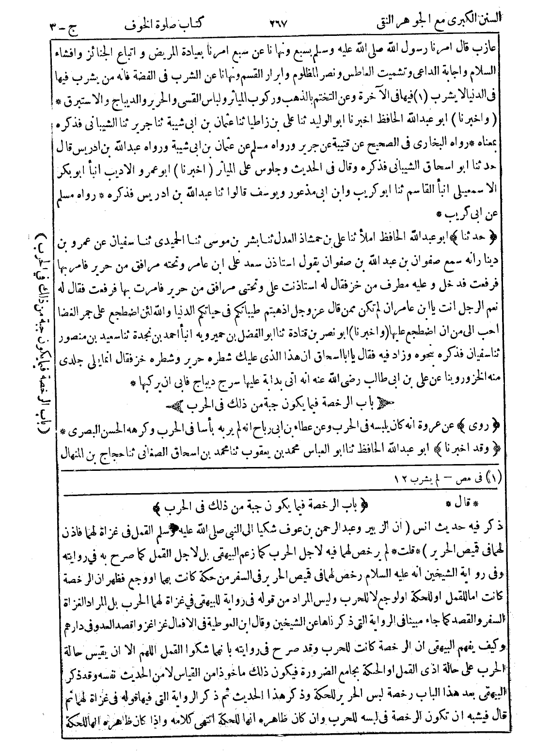 * قال * {باب الرخصة فيما يكون جبة من ذلك في الحرب} ذكر فيه حديث انس (ان الزبير وعبد الرحمن بن عوف شكيا إلى النبي صلى الله عليه وسلم القمل في غزاة لهما فاذن لهما في قميص الحرير) * قلت * لم يرخص لهما فيه لاجل الحرب كما زعم البيهقى بل لاجل القمل كما صرح به في روايته وفى رواية الشيخين انه عليه السلام رخص لهما في قميص الحرير في السفر من حكة كانت بهما أو وجع فظهر ان الرخصة كانت اما للقمل أو للحكة أو لوجع لا للحرب وليس المراد من قوله في رواية للبيهقي في غزاة لهما الحرب بل المراد الغزاة السفر والقصد كما جاء مبينا في الرواية التى ذكرناها عن الشيخين وقال ابن العوطية في الافعال غزا غزوا قصد العدو في دارهم وكيف يفهم البيهقى ان الرخصة كانت للحرب وقد صرح في روايته بانهما شكوا القمل اللهم الا ان يقيس حالة الحرب على حالة اذى القمل أو الحكة بجامع الضرورة فيكون ذلك ماخوذا من القياس لا من الحديث نفسه وقد ذكر البيهقى بعد هذا الباب رخصة لبس الحرير للحكة وذكر هذا الحديث ثم ذكر الرواية التى فيها قوله في غزاة لهما ثم قال فيشبه ان تكون الرخصة في لبسه للحرب وان كان ظاهره انها للحكة انتهى كلامه وإذا كان ظاهره انها للحكة