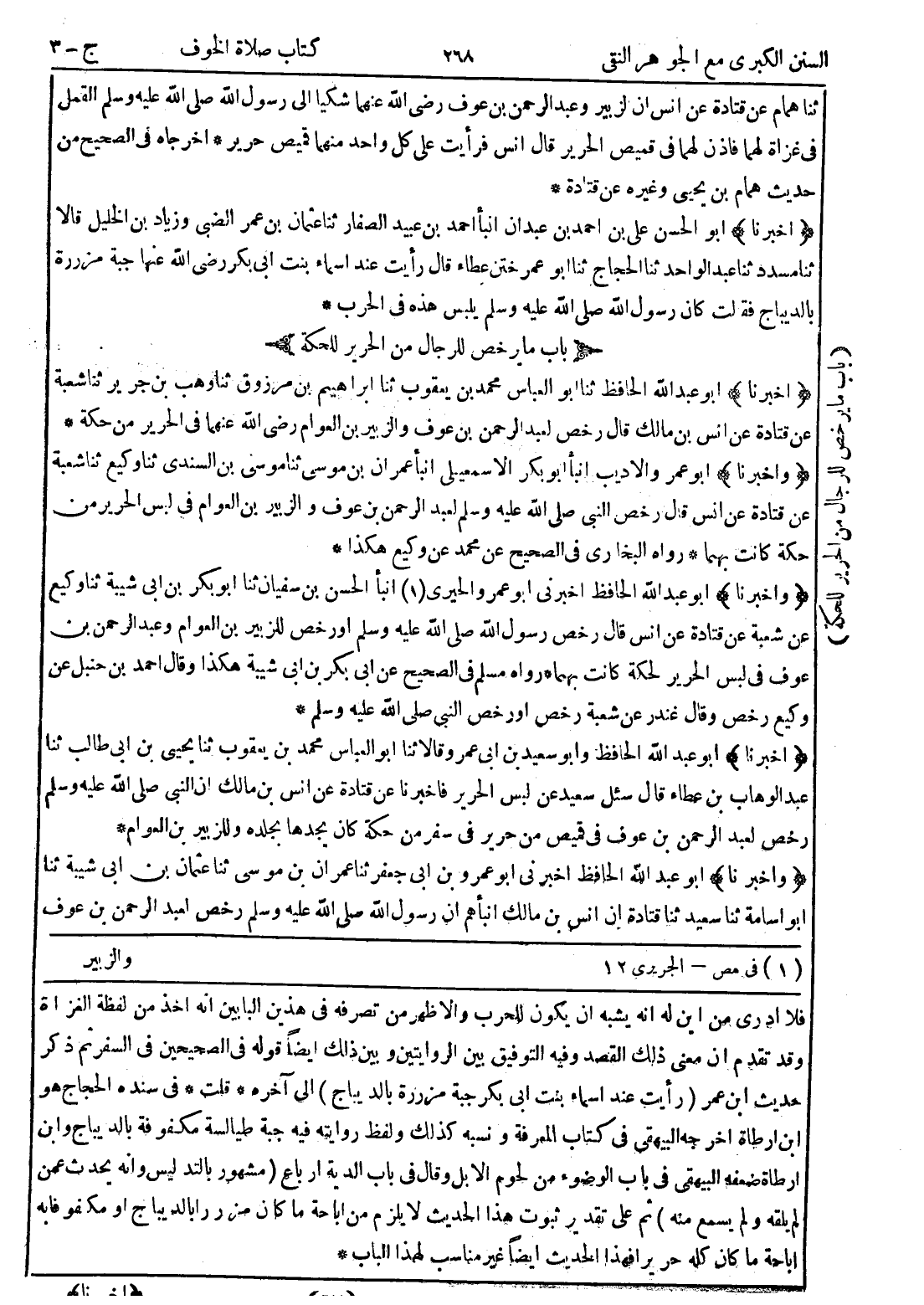 وقد تقدم ان معنى ذلك القصد وفيه التوفيق بين الروايتين وبين ذلك ايضا قوله في الصحيحين في السفر ثم ذكر حديث ابن عمر (رأيت عند اسماء بنت ابى بكر جبة مزررة بالديباج) إلى آخره * قلت * في سنده الحجاج هو ابن ارطاة اخرجه البيهقى في كتاب المعرفة ونسبه كذلك ولفظ روايته فيه جبة طيالسة مكفوفة بالديباج وابن ارطاة ضعفه البيهقى في باب الوضوء من لحوم الابل وقال في باب الدية ارباع (مشهور بالتدليس وانه يحدث عمن لم يلقه ولم يسمع منه) ثم على تقدير ثبوت هذا الحديث لا يلزم من اباحة ما كان مزررا بالديباج أو مكفوفا به اباحة ما كان كله حرير فهذا الحديث ايضا غير مناسب لهذا الباب *