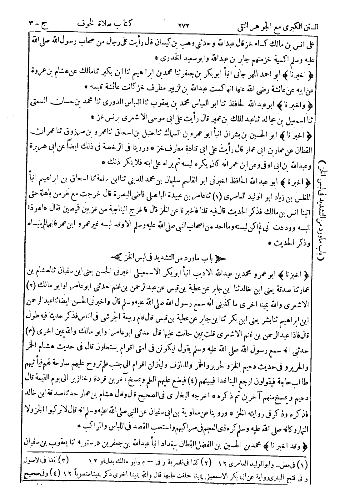 عمار ثنا صدقة يعنى ابن خالد ثنا ابن جابر عن عطية بن قيس عن عبد الرحمن بن غنم حدثني أبو عامر أو أبو مالك (2) الاشعري والله يمينا اخرى ما كذبني انه سمع رسول الله صلى الله عليه وسلم قال واخبرني الحسن ايضا ثنا عبد الرحمن ابن ابراهيم ثنا بشر يعني ابن بكر ثنا ابن جابر عن عطية بن قيس قال قام ربيعة الجرشي في الناس فذكر حديثا فيه طول قال فإذا عبد الرحمن بن غنم الاشعري قلت يمين حلفت عليها قال حدثني أبو عامر أو أبو مالك والله يمين اخرى (3) حدثني انه سمع رسول الله صلى الله عليه وسلم يقول ليكونن في امتي اقوام يستحلون قال في حديث هشام الخمر والحرير وفي حديث دحيم الخز والحرير والخمر والمعازف ولينزلن اقوام إلى جنب علم تروح عليهم سارحة لهم فيأتيهم طالب حاجة فيقولون ارجع الينا غدا فيبيتهم (4) فيضع عليهم العلم ويمسخ آخرين قردة وخنازير إلى يوم القيمة قال دحيم ويمسخ منهم آخرين ثم ذكره * اخرجه البخاري في الصحيح قال وقال هشام بن عمار حدثنا صدقة ابن خالد فذكره وذكر في روايته الخز * وروينا عن معاوية بن ابي سفيان عن النبي صلى الله عليه وسلم انه قال لا تركبوا الخز ولا النمار وكأنه صلى الله عليه وسلم كره زي العجم في مراكبهم واستحب القصد في اللباس والمراكب * (وقد اخبرنا) محمد بن الحسين بن الفضل القطان ببغداد انبأ عبد الله بن جعفر بن درستويه ثنا يعقوب بن سفيان