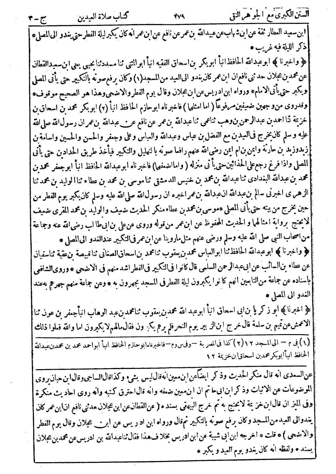 عن السعدى انه قال منكر الحديث وذكر ايضا عن ابن معين انه قال ليس بشئ وكذا قال الساجى وقال ابن حبان يروى الموضوعات عن الاثبات وذكر ابن ابى حاتم ان ابن معين ضعفه وانه قال احترق كتبه وانه روى احاديث منكرة وفى الميزان قال ابن خزيمة لا يحتج به ثم خرج البيهقى بسنده (عن القطان عن ابن عجلان حدثنى نافع ان ابن عمر كان يغدوا إلى العيد من المسجد وكان يرفع صوته بالتكبير ثم قال ورواه ابن ادريس عن ابن عجلان وقال يوم الفطر والاضحى) * قلت * اخرجه ابن ابى شيبة عن ابن ادريس بخلاف هذا فقال ثنا عبد الله بن ادريس عن محمد بن عجلان بسنده ولفظه انه كان يغدو يوم العيد ويكبر *