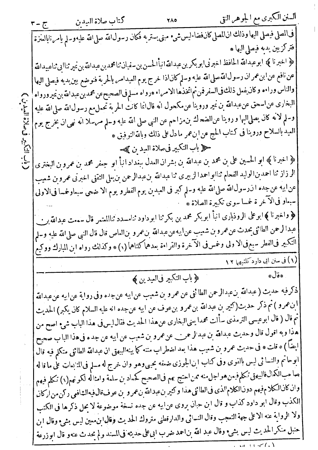 هذا وبه اقول قال وحديث عبد الله بن عبد الرحمن عن عمرو بن شعيب عن ابيه عن جده في هذا الباب صحيح ايضا) * قلت * في حديث عمرو بن شعيب هذا بعد اضطراب متنه كما بينه البيهقى ان عبد الله الطائفي متكلم فيه قال أبو حاتم والنسائي ليس بالقوى وفى كتاب ابن الجوزى ضعفه يحيى وهو وان خرج له مسلم في المتابعات على ما قاله صاحب الكمال فالبيهقى تكلم فيمن هو اجل منه ممن احتج بهم في الصحيح كحماد بن سلمة وامثاله لكونهم (1) تكلم فيهم وان كان الكلام فيهم دون الكلام الذى في الطائفي هذا وكثير بن عبد الله بن عمرو بن عوف قال فيه الشافعي ركن من اركان الكذب وقال أبو داود كذاب وقال ابن حبان يروى عن ابيه عن جده نسخة موضوعة لا يحل ذكرها في الكتب ولا الرواية عنه الا على جهة التعجب وقال النسائي والدارقطني متروك الحديث وقال ابن معين ليس بشئ وقال ابن حنبل منكر الحديث ليس بشئ وقال عبد الله بن احمد ضرب ابى على حديثه في المسند ولم يحدث عنه وقال أبو زرعة