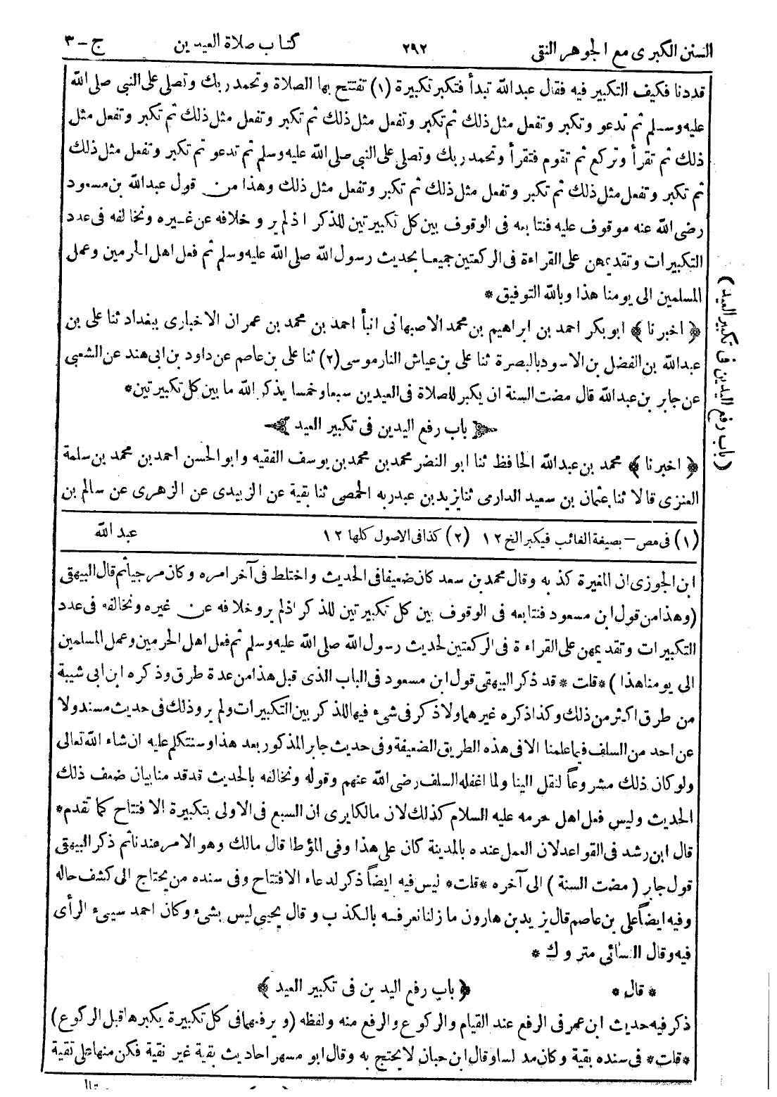 ابن الجوزى ان المغيرة كذبه وقال محمد بن سعد كان ضعيفا في الحديث واختلط في آخر امره وكان مرجيا ثم قال البيهقى (وهذا من قول ابن مسعود فنتابعه في الوقوف بين كل تكبيرتين للذكر إذ لم يرو خلافه عن غيره ونخالفه في عدد التكبيرات وتقديمهن على القراءة في الركعتين لحديث رسول الله صلى الله عليه وسلم ثم فعل اهل الحرمين وعمل المسلمين إلى يومنا هذا) * قلت * قد ذكر البيهقى قول ابن مسعود في الباب الذى قبل هذا من عدة طرق وذكره ابن ابى شيبة من طرق اكثر من ذلك وكذا ذكره غيرهما ولا ذكر في شئ فيها للذكر بين التكبيرات ولم يرو ذلك في حديث مسند ولا عن احد من السلف فيما علمنا الا في هذه الطريق الضعيفة وفى حديث جابر المذكور بعد هذا وسنتكلم عليه ان شاء الله تعالى ولو كان ذلك مشروعا لنقل الينا ولما اغفله السلف رضى الله عنهم وقوله ونخالفه بالحديث قد قدمنا بيان ضعف ذلك الحديث وليس فعل اهل حرمة عليه السلام كذلك لان مالكا يرى ان السبع في الاولى بتكبيرة الافتتاح كما تقدم * قال ابن رشد في القواعد لان العمل عنده بالمدينة كان على هذا وفى المؤطا قال مالك وهو الامر عندنا ثم ذكر البيهقى قول جابر (مضت السنة) إلى آخره * قلت * ليس فيه ايضا ذكر لدعاء الافتتاح وفى سنده من يحتاج إلى كشف حاله