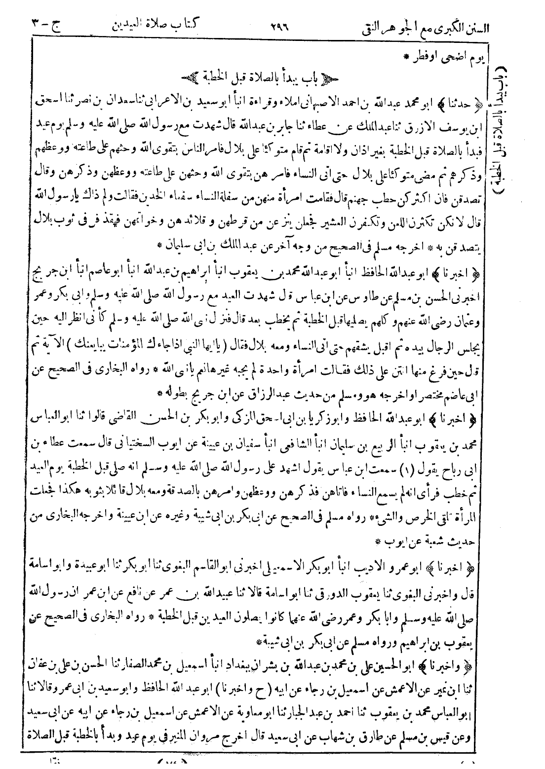 قال واخبرني البغوي ثنا يعقوب الدورقي ثنا أبو اسامة قالا ثنا عبيد الله بن عمر عن نافع عن ابن عمر ان رسول الله صلى الله عليه وسلم وابا بكر وعمر رضي الله عنهما كانوا يصلون العيدين قبل الخطبة * رواه البخاري في الصحيح عن يعقوب بن ابراهيم ورواه مسلم عن ابي بكر بن ابي شيبة *