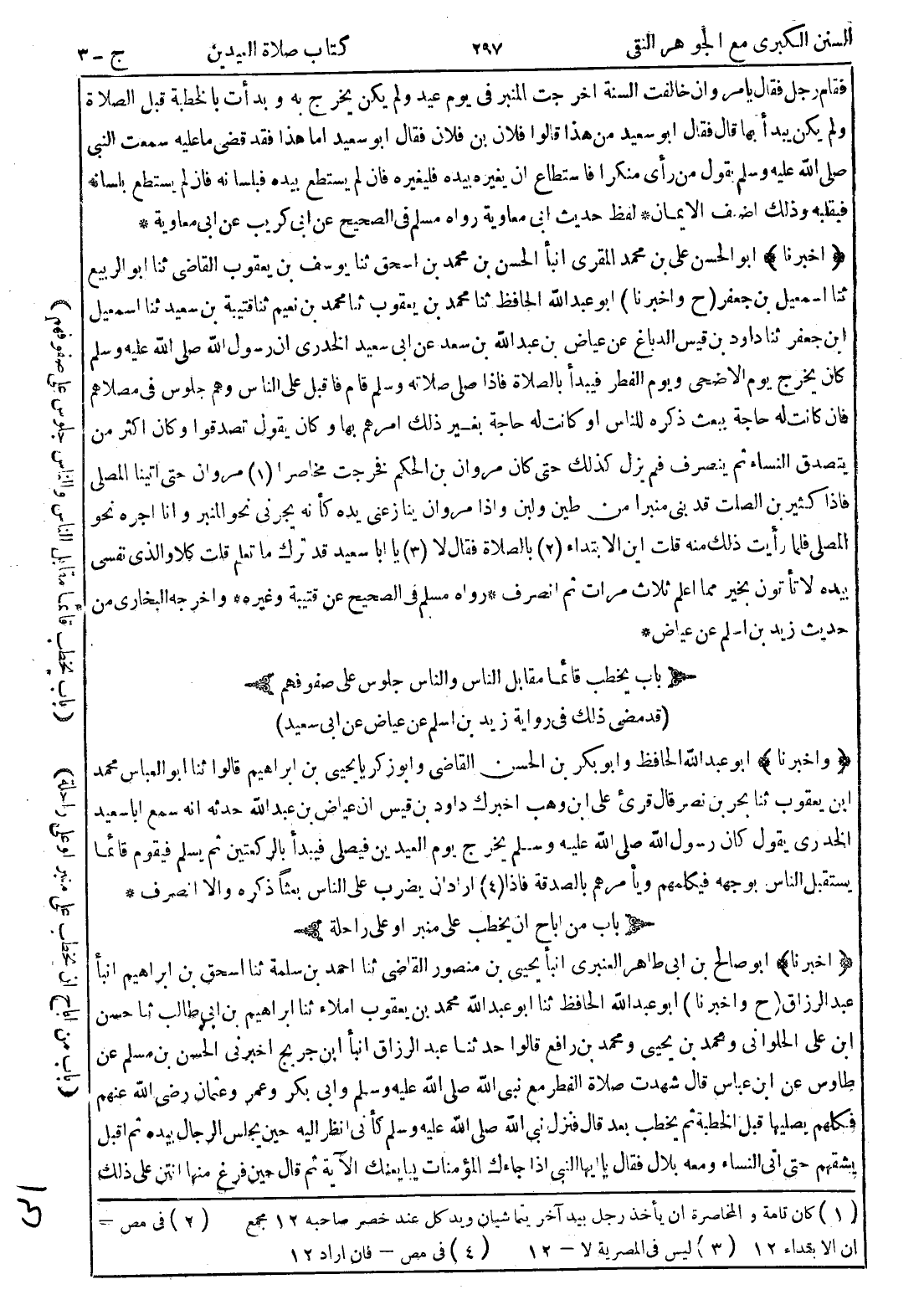 (أخبرنا) أبو الحسن علي بن محمد المقري انبأ الحسن بن محمد بن اسحق ثنا يوسف بن يعقوب القاضي ثنا أبو الربيع ثنا اسمعيل بن جعفر (ح واخبرنا) أبو عبد الله الحافظ ثنا محمد بن يعقوب ثنا محمد بن نعيم ثنا قتيبة بن سعيد ثنا اسمعيل ابن جعفر ثنا داود بن قيس الدباغ عن عياض بن عبد الله بن سعد عن ابي سعيد الخدري ان رسول الله صلى الله عليه وسلم كان يخرج يوم الاضحى ويوم الفطر فيبدأ بالصلاة فإذا صلى صلاته وسلم قام فاقبل على الناس وهم جلوس في مصلاهم فان كانت له حاجة ببعث ذكره للناس أو كانت له حاجة بغير ذلك امرهم بها وكان يقول تصدقوا وكان اكثر من يتصدق النساء ثم ينصرف فلم يزل كذلك حتى كان مروان بن الحكم فخرجت مخاصرا (1) مروان حتى اتينا المصلى فإذا كثير بن الصلت قد بنى منبرا من طين ولبن وإذا مروان ينازعني يده كأنه يجرني نحو المنبر وانا اجره نحو المصلى فلما رأيت ذلك منه قلت اين الابتداء (2) بالصلاة فقال لا (3) يا ابا سعيد قد ترك ما تعلم قلت كلا والذي نفسي بيده لا تأتون بخير مما اعلم ثلاث مرات ثم انصرف * رواه مسلم في الصحيح عن قتيبة وغيره * واخرجه البخاري من