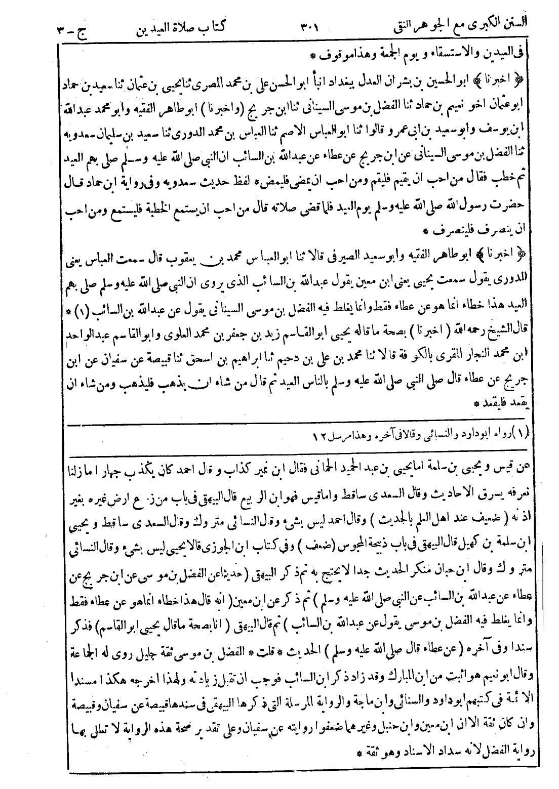 عن قيس ويحيى بن سلمة اما يحيى بن عبد الحميد الحمانى فقال ابن نمير كذاب وقال احمد كان يكذب جهارا مازلنا نعرفه يسرق الاحاديث وقال السعدى ساقط واما قيس فهو ابن الربيع قال البيهقى في باب من زرع ارض غيره بغير اذنه (ضعيف عند اهل العلم بالحديث) وقال احمد ليس بشئ وقال النسائي متروك وقال السعدى ساقط ويحيى ابن سلمة بن كهيل قال البيهقى في باب ذبيحة المجوس (ضعف) وفى كتاب ابن الجوزى قالا يحيى ليس بشئ وقال النسائي متروك وقال ابن حبان منكر الحديث جدا لا يحتج به ثم ذكر البيهقى (حديثا عن الفضل بن موسى عن ابن جريج عن عطاء عن عبد الله بن السائب عن النبي صلى الله عليه وسلم) ثم ذكر عن ابن معين (انه قال هذا خطاء انما هو عن عطاء فقط وانما يغلط فيه الفضل بن موسى يقول عن عبد الله بن السائب) ثم قال البيهقى (انا بصحة ما قال يحيى أبو القاسم) فذكر سندا وفى آخره (عن عطاء قال صلى الله عليه وسلم) الحديث * قلت * الفضل بن موسى ثقة جليل روى له الجماعة وقال أبو نعيم هو اثبت من ابن المبارك وقد زاد ذكر ابن السائب فوجب ان تقبل زيادته ولهذا اخرجه هكذا مسندا الائمة في كتبهم أبو داود والنسائي وابن ماجة والرواية المرسلة التى ذكرها البيهقى في سندها قبيصة عن سفيان وقبيصة