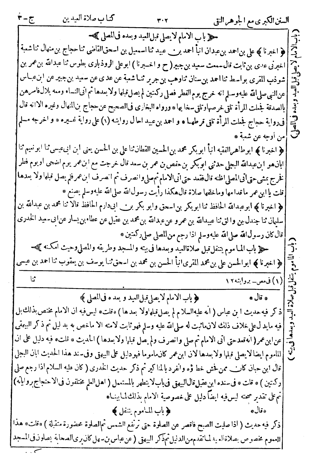 * قال * {باب الامام لا يصلى قبل العيد وبعده في المصلى} ذكر فيه حديث ابن عباس (انه عليه السلام لم يصل قبلها ولا بعدها) * قلت * ليس فيه ان الامام مختص بذلك بل فيه ما يدل على خلاف ذلك لان ما ثبت له صلى الله عليه وسلم فهو ثابت لامته الا ما خص به بدليل ثم ذكر البيهقى عن ابن عمر (انه قعد حتى اتى الامام ثم صلى وانصرف ولم يصل قبلها ولا بعدها) الحديث * قلت * فيه دليل على ان المأموم ايضا لا يصلى قبلها ولا بعدها لان ابن عمر كان ماموما فهو دليل على البيهقى وفى سند هذا الحديث ابان البجلى قال ابن حبان كان ممن فحش خطاؤه وانفرد بالمناكير ثم ذكر حديث الخدرى (كان عليه السلام إذا رجع صلى ركعتين) * قلت * في سنده ابن عقيل قال البيهقى في باب لا يتطهر بالمستعمل (اهل العلم مختلفون في الاحتجاج برواياته) ثم على تقدير صحته ليس فيه ايضا دليل على خصوصية الامام بذلك لما بينا * * قال * {باب المأموم يتنفل} ذكر فيه حديث (إذا صليت الصبح فاقصر عن الصلوة حتى ترتفع الشمس ثم الصلوة محضورة متقبلة) * قلت * هذا العموم مخصوص بصلاة العيد لما تقدم من الدليل ثم ذكر البيهقى (عن عباس بن سهل كان يرى الصحابة يصلون في المسجد