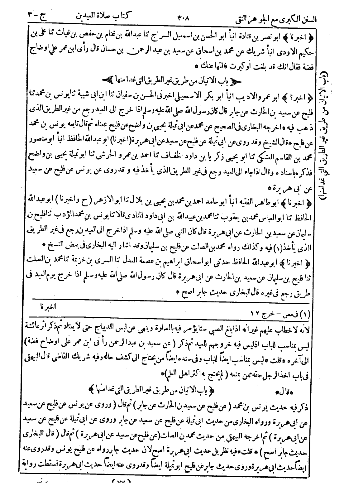 ليس بمناسب للباب إذ ليس فيه خروجهم للعيد ثم ذكر (عن سعيد بن عبد الرحمن رأني ابن عمر على اوضاح فضة) إلى آخره * قلت * ليس بمناسب ايضا للباب وفي سنده ايضا من يحتاج إلى كشف حاله وفيه شريك القاضى قال البيهقى في باب اخذ الرجل حقه ممن يمنعه (لم يحتج به اكثر اهل العلم) * * قال * {باب الاتيان من طريق غير الطريق التى غدا منها} ذكر فيه حديث يونس بن محمد (عن فليح عن سعيد بن الحارث عن جابر) ثم قال (وروى عن يونس عن فليح عن سعيد عن ابى هريرة ورواه البخاري من حديث ابى تميلة عن فليح عن سعيد عن جابر وروى عن ابى تميلة عن فليح عن سعيد عن ابى هريرة) ثم اخرجه البيهقى من حديث محمد بن الصلت (عن فليح عن سعيد عن ابى هريرة) ثم قال (قال البخاري حديث جابر اصح) * قلت * فيه نظر بل حديث ابى هريرة اصح لان حديث جابر رواه عن فليح يونس وقد روى عنه ايضا حديث ابى هريرة وروى حديث جابر عن فليح أبو تميلة ايضا وقد روى عنه ايضا حديث ابى هريرة فسقطت رواية