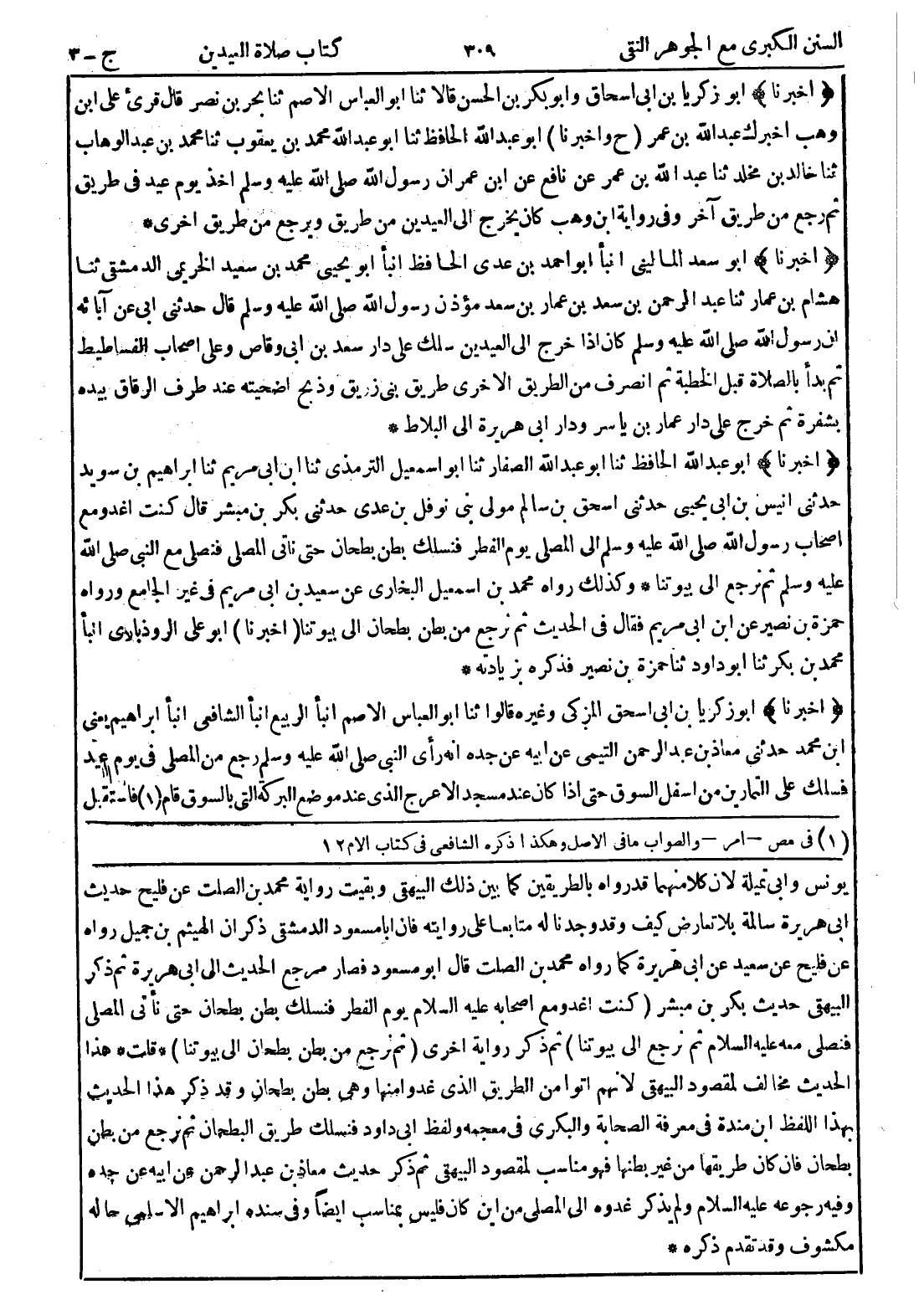يونس وابى تميلة لان كلا منهما قد رواه بالطريقين كما بين ذلك البيهقى وبقيت رواية محمد بن الصلت عن فليح حديث ابى هريرة سالمة بلا تعارض كيف وقد وجدنا له متابعا على روايته فان ابا مسعود الدمشقي ذكر ان الهيثم بن جميل رواه عن فليح عن سعيد عن ابى هريرة كما رواه محمد بن الصلت قال أبو مسعود فصار مرجع الحديث إلى ابى هريرة ثم ذكر البيهقى حديث بكر بن مبشر (كنت اغدوا مع اصحابه عليه السلام يوم الفطر فنسلك بطن بطحان حتى نأتى المصلى فنصلى معه عليه السلام ثم نرجع إلى بيوتنا) ثم ذكر رواية اخرى (ثم نرجع من بطن بطحان إلى بيوتنا) * قلت * هذا الحديث مخالف لمقصود البيهقى لانهم اتوا من الطريق الذى غدوا منها وهى بطن بطحان وقد ذكر هذا الحديث بهذا اللفظ ابن مندة في معرفة الصحابة والبكرى في معجمه ولفظ ابى داود فنسلك طريق البطحان ثم نرجع من بطن بطحان فان كان طريقها من غير بطنها فهو مناسب لمقصود البيهقى ثم ذكر حديث معاذ بن عبد الرحمن عن ابيه عن جده وفيه رجوعه عليه السلام ولم يذكر غدوه إلى المصلى من اين كان فليس بمناسب ايضا وفى سنده ابراهيم الاسلمي حاله مكشوف وقد تقدم ذكره *