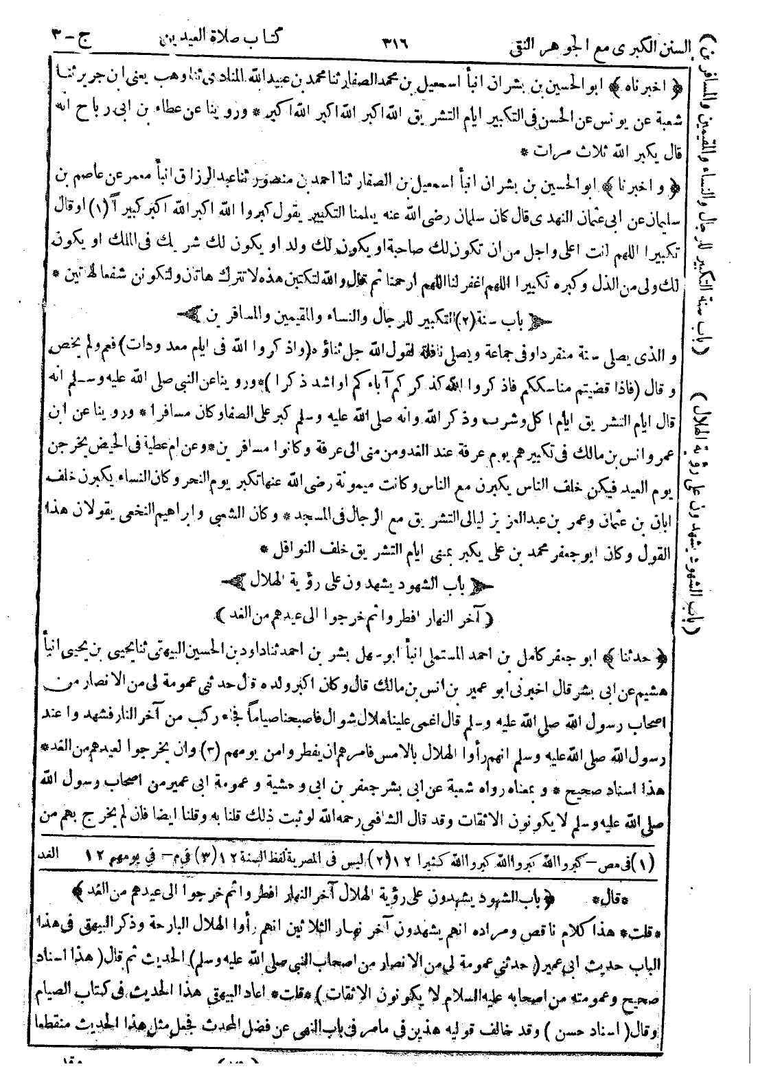 * قال * {باب الشهود يشهدون على رؤية الهلال آخر النهار افطروا ثم خرجوا إلى عيدهم من الغد} * قلت * هذا كلام ناقص ومراده انهم يشهدون آخر نهار الثلاثين انهم رأوا الهلال البارحة وذكر البيهقى في هذا الباب حديث ابى عمير (حدثنى عمومة لى من الانصار من اصحاب النبي صلى الله عليه وسلم) الحديث ثم قال (هذا اسناد صحيح وعمومته من اصحابه عليه السلام لا يكونون الا ثقات) * قلت * اعاد البيهقى هذا الحديث في كتاب الصيام وقال (اسناد حسن) وقد خالف قوليه هذين في ما مر في باب النهى عن فضل المحدث فجعل مثل هذا الحديث منقطعا