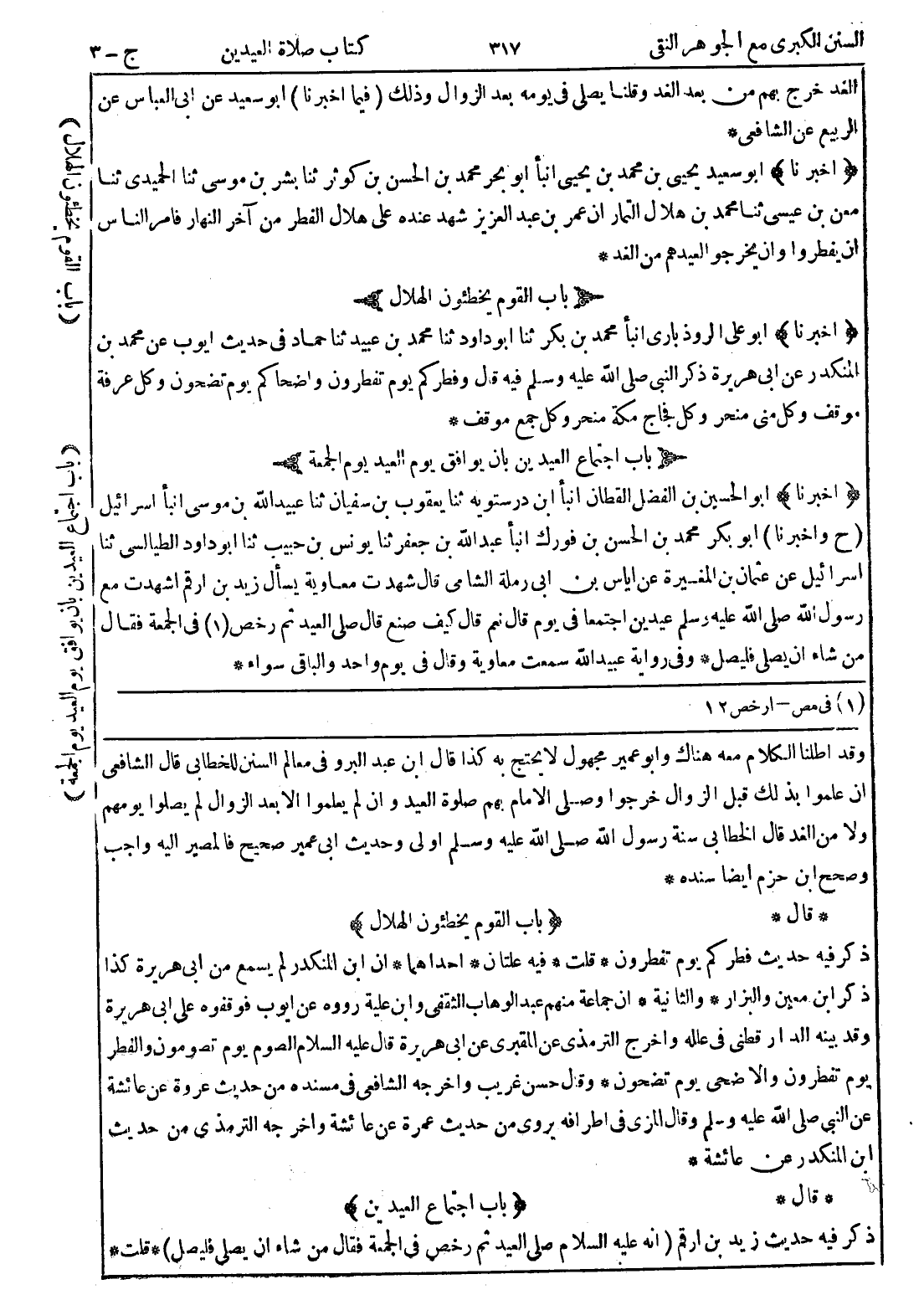 ان علموا بذلك قبل الزوال خرجوا وصلى الامام بهم صلوة العيد وان لم يعلموا الا بعد الزوال لم يصلوا يومهم ولا من الغد قال الخطابى سنة رسول الله صلى الله عليه وسلم اولى وحديث ابى عمير صحيح فالمصير إليه واجب وصحح ابن حزم ايضا سنده * * قال * {باب القوم يخطئون الهلال} ذكر فيه حديث فطركم يوم تفطرون * قلت * فيه علتان * احداهما * ان ابن المنكدر لم يسمع من ابى هريرة كذا ذكر ابن معين والبزار * والثانية * ان جماعة منهم عبد الوهاب الثقفى وابن علية رووه عن ايوب فوقفوه على ابى هريرة وقد بينه الدارقطني في علله واخرج الترمذي عن المقبرى عن ابى هريرة قال عليه السلام الصوم يوم تصومون والفطر يوم تفطرون والاضحى يوم تضحون * وقال حسن غريب واخرجه الشافعي في مسنده من حديث عروة عن عائشة عن النبي صلى الله عليه وسلم وقال المزى في اطرافه يروى من حديث عمرة عن عائشة واخرجه الترمذي من حديث ابن المنكدر عن عائشة * * قال * {باب اجتماع العيدين} ذكر فيه حديث زيد بن ارقم (انه عليه السلام صلى العيد ثم رخص في الجمعة فقال من شاء ان يصلى فليصل) * قلت *