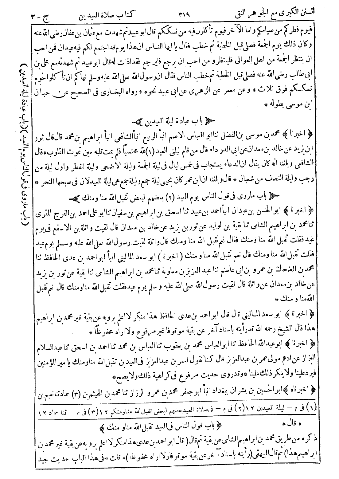 * قال * {باب قول الناس في العيد تقبل الله منا ومنك} ذكره من طريق محمد بن ابراهيم الشامي عن بقية ثم قال (قال أبو احمد بن عدى هذا منكر لا اعلم يرويه عن بقية غير محمد بن ابراهيم هذا) ثم قال البيهقى (رأيته باسناد آخر عن بقية موقوفا ولا اراه محفوظ) * قلت * في هذا الباب حديث جيد