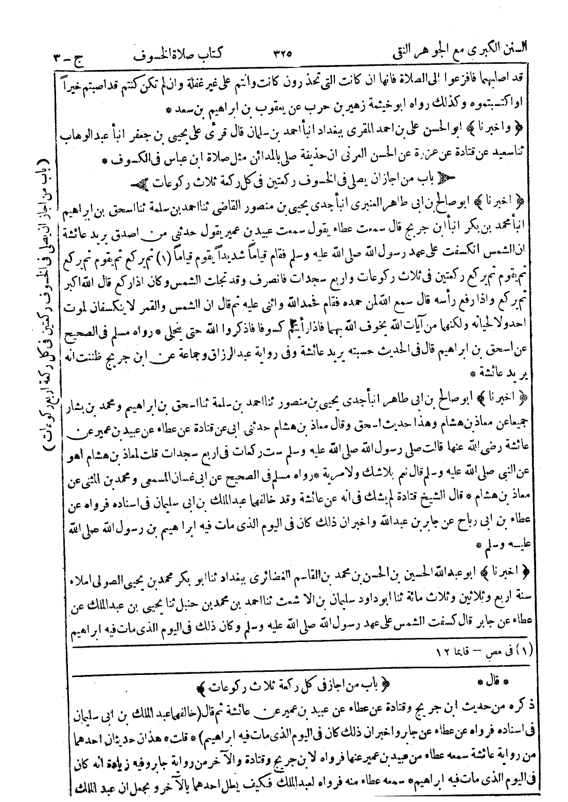 * قال * {باب من اجاز في كل ركعة ثلاث ركوعات} ذكره من حديث ابن جريج وقتادة عن عطاء عن عبيد بن عمير عن عائشة ثم قال (خالفهما عبد الملك بن ابى سليمان في اسناده فرواه عن عطاء عن جابر واخبر ان ذلك كان في اليوم الذى مات فيه ابراهيم) * قلت * هذان حديثان احدهما من رواية عائشة سمعه عطاء من عبيد بن عمير عنها فرواه لابن جريج وقتادة والآخر من رواية جابر وفيه زيادة انه كان في اليوم الذى مات فيه ابراهيم * سمعه عطاء منه فرواه لعبد الملك فكيف يعلل احدهما بالآخر ويجعل ان عبد الملك