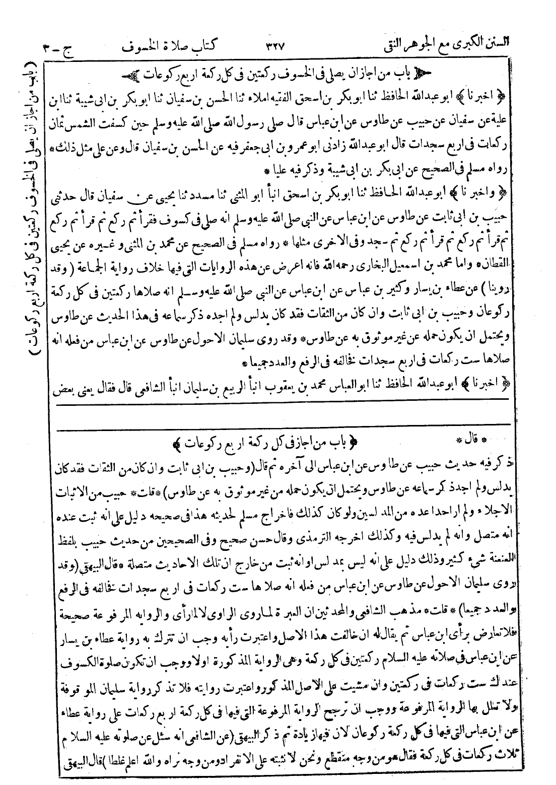 ذكر فيه حديث حبيب عن طاوس عن ابن عباس إلى آخره ثم قال (وحبيب بن ابى ثابت وان كان من الثقات فقد كان يدلس ولم اجد ذكر سماعه عن طاوس ويحتمل ان يكون حمله من غير موثوق به عن طاوس) * قلت * حبيب من الاثبات الاجلاء ولم ار احدا عده من المدلسين ولو كان كذلك فاخراج مسلم لحديثه هذا في صحيحه دليل على انه ثبت عنده انه متصل وانه لم يدلس فيه وكذلك اخرجه الترمذي وقال حسن صحيح وفى الصحيحين من حديث حبيب بلفظ العنعنة شئ كثير وذلك دليل على انه ليس بمدلس أو انه ثبت من خارج ان تلك الاحاديث متصلة * قال البيهقى (وقد روى سليمان الاحول عن طاوس عن ابن عباس من فعله انه صلاها ست ركعات في اربع سجدات فخالفة في الرفع والعدد جميعا) * قلت * مذهب الشافعي والمحدثين ان العبرة لما روى الراوى لا لما رأى والرواية المرفوعة صحيحة فلا تعارض برأى ابن عباس ثم يقال له ان خالفت هذا الاصل واعتبرت رأيه وجب ان تترك به رواية عطاء بن يسار عن ابن عباس في صلاته عليه السلام ركعتين في كل ركعة وهى الرواية المذكورة اولا ووجب ان تكون صلوة الكسوف عندك ست ركعات في ركعتين وان مشيت على الاصل المذكور واعتبرت روايته فلا تذكر رواية سليمان الموقوفة ولا تعلل بها الرواية المرفوعة ووجب ان ترجح الرواية المرفوعة التى فيها في كل ركعة اربع ركعات على رواية عطاء عن ابن عباس التى فيها في كل ركعة ركوعان لان فيها زيادة ثم ذكر البيهقى (عن الشافعي انه سئل عن صلوته عليه السلام ثلاث ركعات في كل ركعة فقال هو من وجه منقطع ونحن لا نثبته على الانفراد ومن وجه نراه والله اعلم غلطا) قال البيهقى