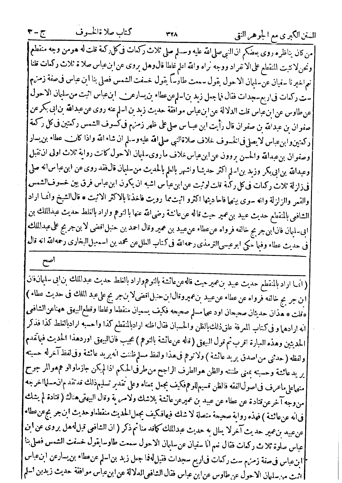 من وجه آخر عن قتادة عن عطاء عن عبيد بن عمير عن عائشة بلا شك ولا مرية وقال البيهقى هناك (قتادة لم يشك في انه عن عائشة) فهذه رواية صحيحة متصلة لا شك فيها فكيف يجعل الحديث منقطعا وحديث ابن جريج عن عطاء عن عبيد بن عمير حديث آخر لا يعلل به حديث عبد الملك كما قدمنا ثم ذكر (ان الشافعي قيل له هل يروى عن ابن عباس صلوة ثلاث ركعات فقال نعم انا سفيان عن سليمان الاحول سمعت طاوسا يقول خسفت الشمس فصلى بنا ابن عباس في صفة زمزم ست ركعات في اربع سجدات فقيل له فما جعل زيد بن اسلم عن عطاء بن يسار عن ابن عباس اثبت من سليمان الاحول عن طاوس عن ابن عباس فقال الشافعي الدلالة عن ابن عباس موافقة حديث زيد بن اسلم