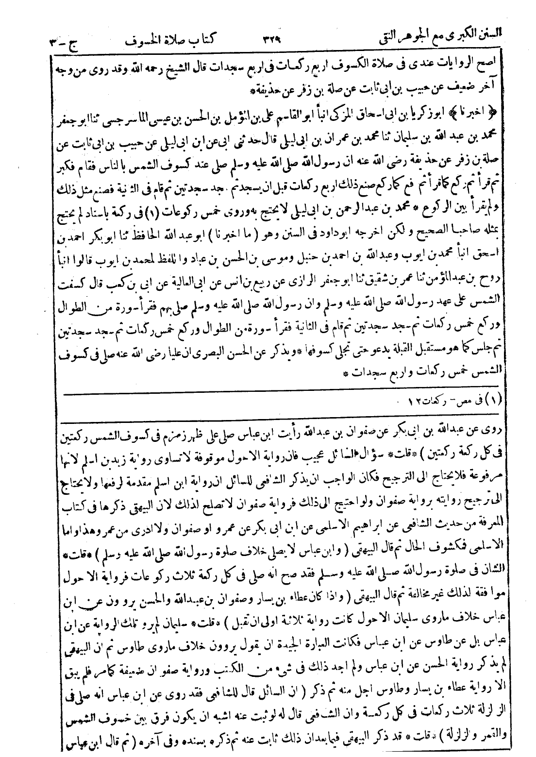 روى عن عبد الله بن ابى بكر عن صفوان بن عبد الله رأيت ابن عباس صلى على ظهر زمزم في كسوف الشمس ركعتين في كل ركعة ركعتين) * قلت * سؤال السائل عجيب فان رواية الاحول موقوفة لا تساوى رواية زيد بن اسلم لانها مرفوعة فلا يحتاج إلى الترجيح فكان الواجب ان يذكر الشافعي للسائل ان رواية ابن اسلم مقدمة لرفعها ولا يحتاج إلى ترجيح روايته برواية صفوان ولو احتيج إلى ذلك فرواية صفوان لا تصلح لذلك لان البيهقى ذكرها في كتاب المعرفة من حديث الشافعي عن ابراهيم الاسلمي عن ابن ابى بكر عن عمرو أو صفوان ولا ادرى من عمرو هذا واما الاسلمي فمكشوف الحال ثم قال البيهقى (وابن عباس لا يصلى خلاف صلوة رسول الله صلى الله عليه وسلم) * قلت * الشان في صلوة رسول الله صلى الله عليه وسلم فقد صح انه صلى في كل ركعة ثلاث ركوعات فرواية الاحول موافقة لذلك غير مخالفة ثم قال البيهقى (وإذا كان عطاء بن يسار وصفوان بن عبد الله والحسن يروون عن ابن عباس خلاف ما روى سليمان الاحول كانت رواية ثلاثة اولى ان تقبل) * قلت * سليمان لم يرو تلك الرواية عن ابن عباس بل عن طاوس عن ابن عباس فكانت العبارة الجيدة ان يقول يروون خلاف ما روى طاوس ثم ان البيهقى لم يذكر رواية الحسن عن ابن عباس ولم اجد ذلك في شئ من الكتب ورواية صفوان ضعيفة كما مر فلم يبق الا رواية عطاء بن يسار وطاوس اجل منه ثم ذكر (ان السائل قال للشافعي فقد روى عن ابن عباس انه صلى في الزلزلة ثلاث ركعات في كل ركعة وان الشافعي قال له لو ثبت عنه اشبه ان يكون فرق بين خسوف الشمس والقمر والزلزلة) * قلت * قد ذكر البيهقى فيما بعد ان ذلك ثابت عنه ثم ذكره بسنده وفى آخره (ثم قال ابن عباس