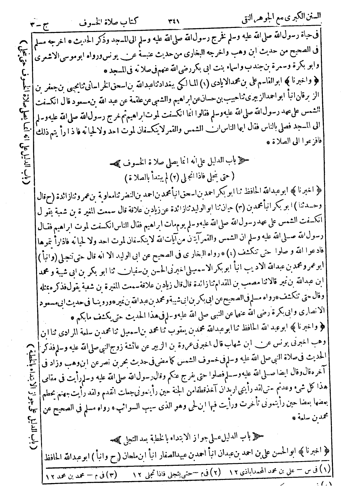 (أخبرنا) أبو عبد الله الحافظ ثنا أبو بكر احمد بن اسحق انبأ امحمد بن احمد بن النضر ثنا معاوية بن عمرو ثنا زائدة (ح قال وحدثنا) أبو بكر انبأ محمد بن (3) حيان ثنا أبو الوليد ثنا زائدة عن زياد بن علاقة قال سمعت المغيرة بن شعبة يقول انكسفت الشمس على عهد رسول الله صلى الله عليه وسلم يوم مات ابراهيم فقال الناس انكسفت لموت ابراهيم فقال رسول الله صلى الله عليه وسلم ان الشمس والقمر آيتان من آيات الله لا ينكسفان لموت احد ولا لحياته فإذا رأيتموها فادعوا الله وصلوا حتى تنكشف (4) * رواه البخاري في الصحيح عن ابى الوليد الا انه قال حتى تنجلي (وانبأ) أبو عمرو محمد بن عبد الله الاديب انبا أبو بكر الاسمعيلي اخبرني الحسن بن سفيان ثنا أبو بكر بن ابي شيبة ومحمد ابن عبد الله بن نمير قالا ثنا مصعب بن المقدام ثنا زائدة قال قال زياد بن علاقة سمعت المغيرة بن شعبة يقول فذكره بمثله