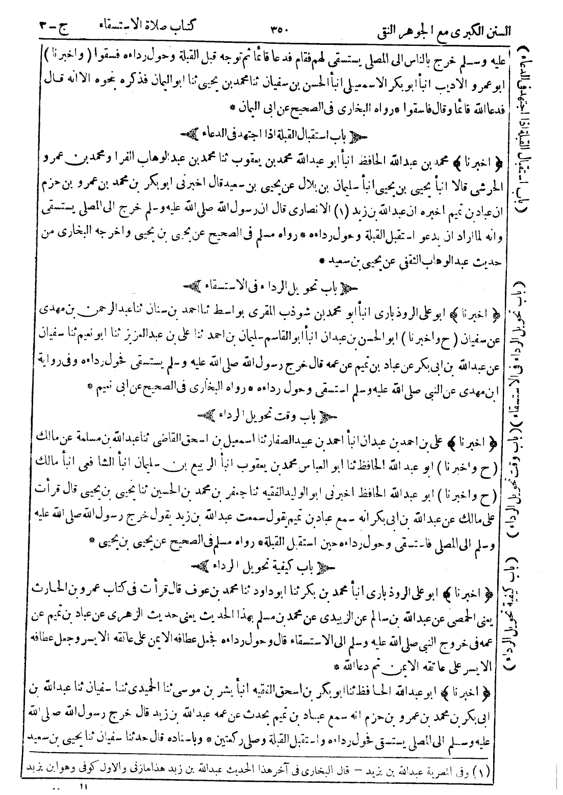 (أخبرنا) أبو علي الروذباري انبأ أبو محمد بن شوذب المقري بواسط ثنا احمد بن سنان ثنا عبد الرحمن بن مهدي عن سفيان (ح واخبرنا) أبو الحسن بن عبدان انبأ أبو القاسم سليمان بن احمد ثنا علي بن عبد العزيز ثنا أبو نعيم ثنا سفيان عن عبد الله بن ابي بكر عن عباد بن تميم عن عمه قال خرج رسول الله صلى الله عليه وسلم يستسقى فحول رداءه وفي رواية ابن مهدي عن النبي صلى الله عليه وسلم استسقى وحول رداءه * رواه البخاري في الصحيح عن ابي نعيم *