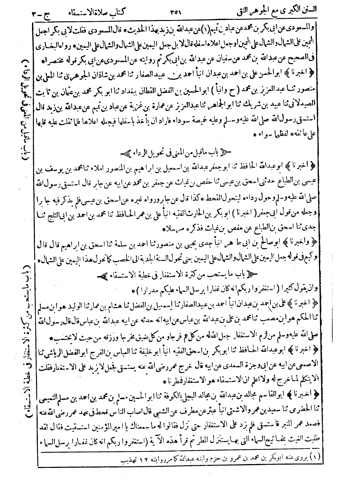 (أخبرنا) أبو الحسن علي بن احمد بن عبدان انبأ احمد بن عبيد الصفار ثنا محمد بن شاذان الجوهري ثنا المعلى بن منصور ثنا عبد العزيز بن محمد (ح وانبأ) أبو الحسين بن الفضل القطان ببغداد ثنا أبو بكر محمد بن عثمان بن ثابت الصيدلاني ثنا عبيد بن شريك ثنا أبو الجماهر ثنا عبد العزيز عن عمارة بن غزية عن عباد بن تميم عن عبد الله بن زيد قال استسقى رسول الله صلى الله عليه وسلم وعليه خميصة سوداء فاراد ان يأخذ باسفلها فيجعله اعلاها فلما ثقلت عليه قلبها على عاتقه * لفظهما سواء *
