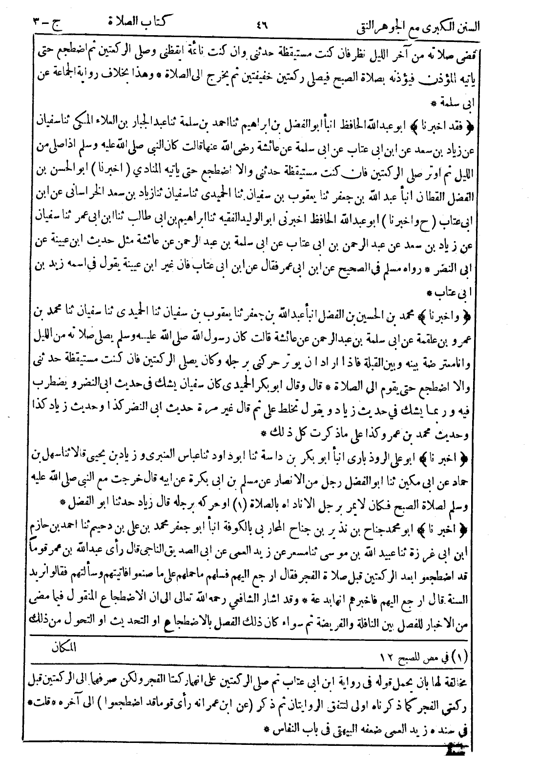 مخالفة لها بان يحمل قوله في رواية ابن ابي عتاب ثم صلى الركعتين على انهما ركعتا الفجر ولكن صرفهما إلى الركعتين قبل ركعتي الفجر كما ذكرناه اولى لتتفق الروايتان ثم ذكر (عن ابن عمر انه رأى قوما قد اضطجعوا) إلى آخره * قلت * في سنده زيد العمى ضعفه البيهقي في باب النفاس *