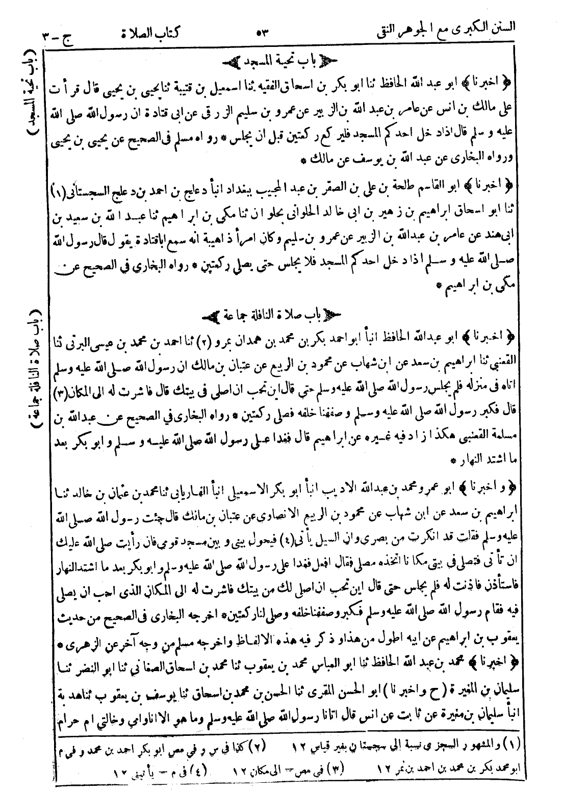 (باب تحية المسجد) (اخبرنا أبو عبد الله الحافظ ثنا أبو بكر بن اسحاق الفقيه ثنا اسمعيل بن قتيبة ثنا يحيى بن يحيى قال قرأت على مالك بن انس بن عامر بن عبد الله بن الزبير عن عمرو بن سليم الزرقي عن ابي قتادة ان رسول الله صلى الله