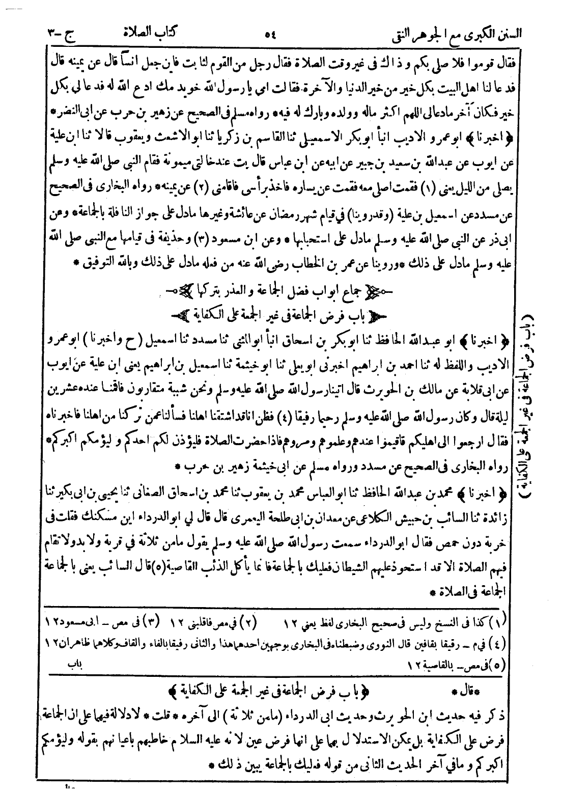 * قال * (باب فرض الجماعة في غير الجمعة على الكفاية) ذكر فيه حديث ابن الحويرث وحديث ابي الدرداء (ما من ثلاثة) إلى آخره * قلت * لا دلالة فيهما على ان الجماعة فرض على الكفاية بل يمكن الاستدلال بهما على انها فرض عين لانه عليه السلام خاطبهم باعيانهم بقوله وليؤمكم اكبركم وما في آخر الحديث الثاني من قوله فعليك بالجماعة يبين ذلك *