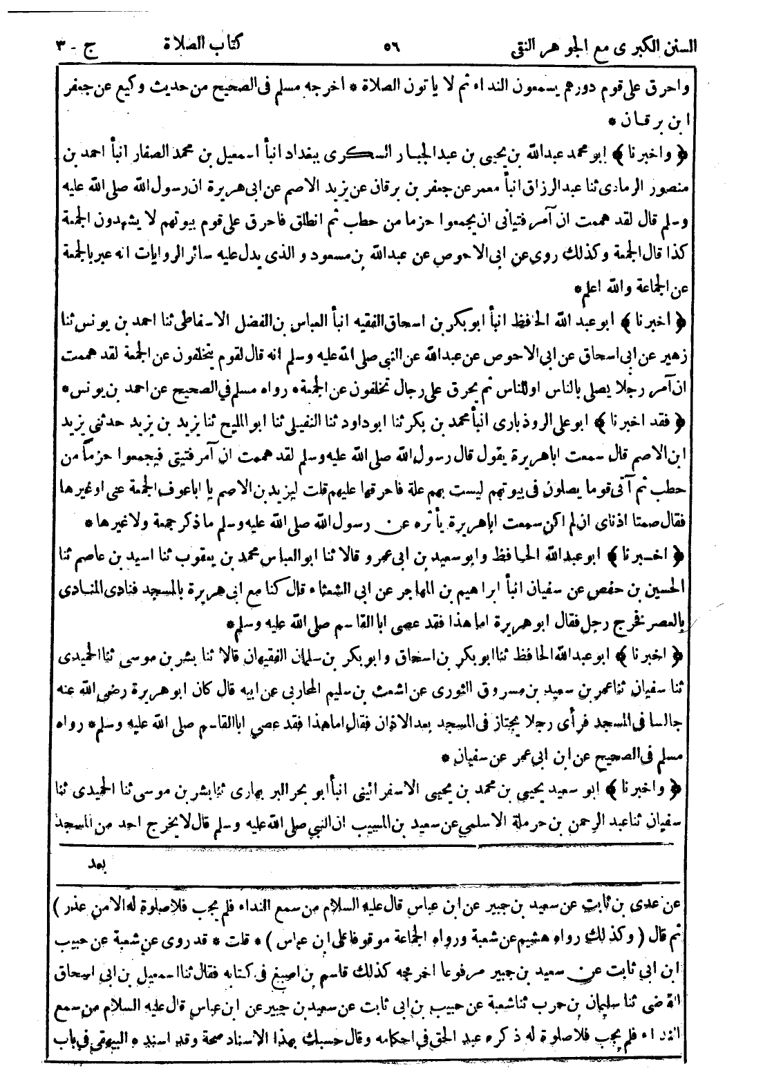 عن عدى بن ثابت عن سعيد بن جبير عن ابن عباس قال عليه السلام من سمع النداء فلم يجب فلا صلوة له الا من عذر) ثم قال (وكذلك رواه هشيم عن شعبة ورواه الجماعة موقوفا على ابن عباس) * قلت * قد روى عن شعبة عن حبيب ابن ابي ثابت عن سعيد بن جبير مرفوعا اخرجه كذلك قاسم بن اصبغ في كتابه فقال ثنا اسماعيل بن ابي اسحاق القاضي ثنا سليمان بن حرب ثنا شعبة عن حبيب بن ابي ثابت عن سعيد بن جبير عن ابن عباس قال عليه السلام من سمع النداء فلم يجب فلا صلوة له ذكره عبد الحق في احكامه وقال حسبك بهذا الاسناد صحة وقد اسنده البيهقي في باب