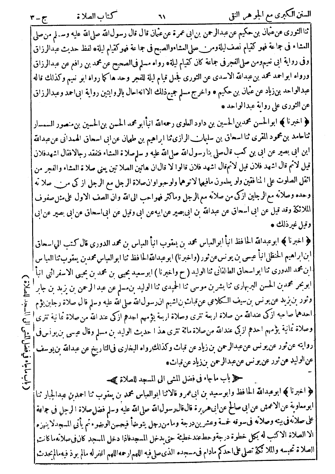 (وأخبرنا) أبو عبد الله الحافظ ثنا أبو العباس محمد بن يعقوب ثنا العباس ابن محمد الدوري ثنا أبو اسحاق الطالقاني ثنا الوليد (ح واخبرنا) أبو سعيد يحيى بن محمد بن يحيى الاسفرائني انبأ أبو بحر محمد بن الحسن البربهاري ثنا بشر بن موسى ثنا الحميدي ثنا الوليد بن مسلم عن عبد الرحمن بن يزيد بن جابر وثور بن يزيد عن يونس بن سيف الكلاعي عن قباث بن اشيم ان رسول الله صلى الله عليه وسلم قال صلاة رجلين يؤم احدهما صاحبه ازكى عند الله من صلاة اربعة تترى وصلاة اربعة يؤمهم احدهم ازكى عند الله من صلاة ثمانية تترى وصلاة ثمانية يؤمهم احدهم ازكى عند الله من صلاة مائة تترى هذا حديث الوليد بن مسلم وقال عيسى بن يونس في روايته عن ثور عن يونس عن عبد الرحمن بن زياد عن قباث وكذلك رواه البخاري في التاريخ عن عبد الله بن يوسف عن الوليد عن ثور عن يونس عن عبد الرحمن بن زياد عن قباث *