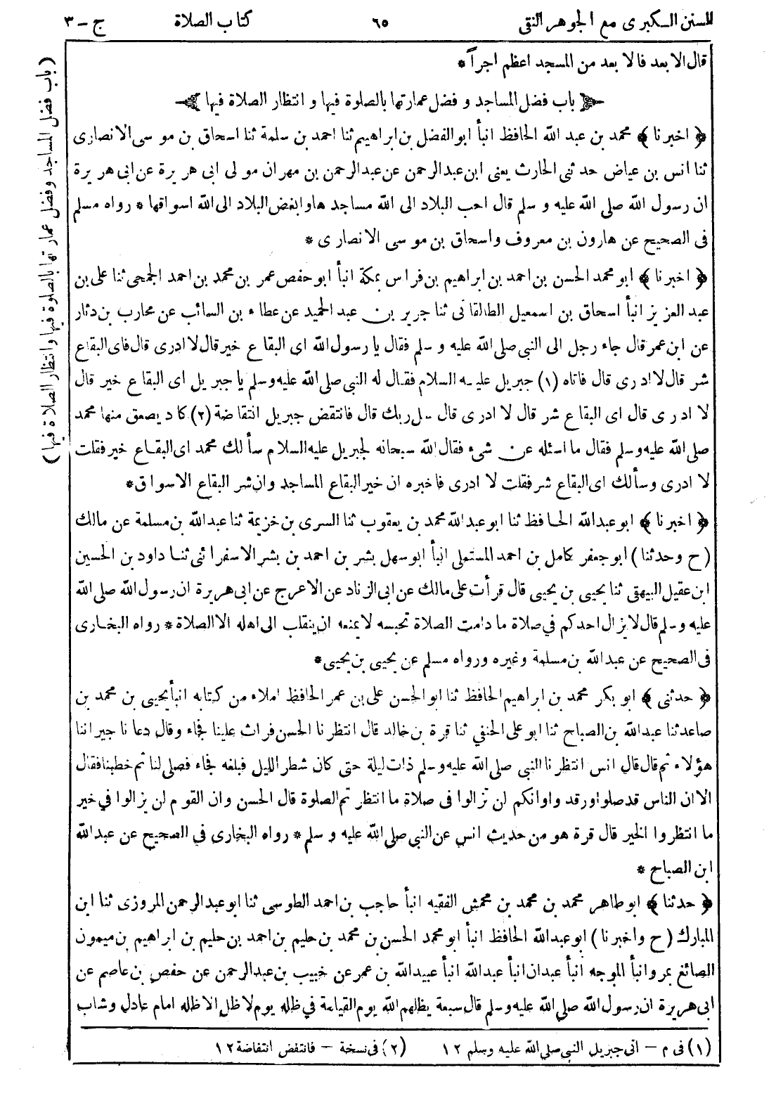 (أخبرنا) أبو محمد الحسن بن احمد بن ابراهيم بن فراس بمكة انبأ أبو حفص عمر بن محمد بن احمد الجمحي ثنا علي بن عبد العزيز انبأ اسحاق بن اسمعيل الطالقاني ثنا جرير بن عبد الحميد عن عطاء بن السائب عن محارب بن دثار عن ابن عمر قال جاء رجل إلى النبي صلى الله عليه وسلم فقال يارسول الله اي البقاع خير قال لا ادرى قال فأى البقاع شر قال لا ادري قال فاتاه (1) جبريل عليه السلام فقال له النبي صلى الله عليه وسلم يا جبريل أي البقاع خير قال لا ادرى قال أي البقاع شر قال لا ادرى قال سل ربك قال فانتقض جبريل انتقاضة (2) كاد يصعق منها محمد صلى الله عليه وسلم فقال ما اسئله عن شئ فقال الله سبحانه لجبريل عليه السلام سألك محمد اي البقاع خير فقلت لا ادري وسألك اي البقاع شر فقلت لا ادري فاخبره ان خير البقاع المساجد وان شر البقاع الاسواق *