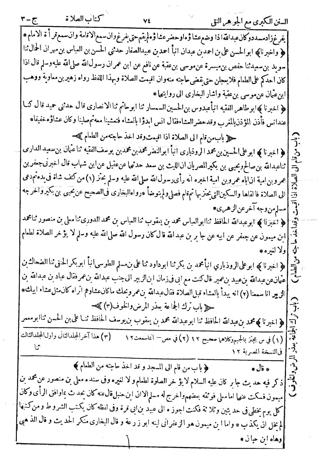 * قال * (باب من قام إلى المسجد وقد اخذ حاجته من الطعام) ذكر فيه حديث جابر كان عليه السلام لا يؤخر الصلوة لطعام ولا لغيره وفي سنده معلى بن منصور عن محمد بن ميمون فسكت عنهما اما معلى فوثقه بعضهم واخرج له مسلم الا ان ابن حنبل قال عنه كان يحدث بما وافق الرأى وكان كال يوم يخطى في حديثين وثلاثة فكنت اجوزه إلى عبيد بن ابي قرة وفي لفظه كان يكتب الشروط ومن كتبها لم يخل ان يكذب * واما ابن ميمون هو الزعفراني لينه أبو زرعة وقال البخاري منكر الحديث وقال الذهبي وهاه ابن حيان *