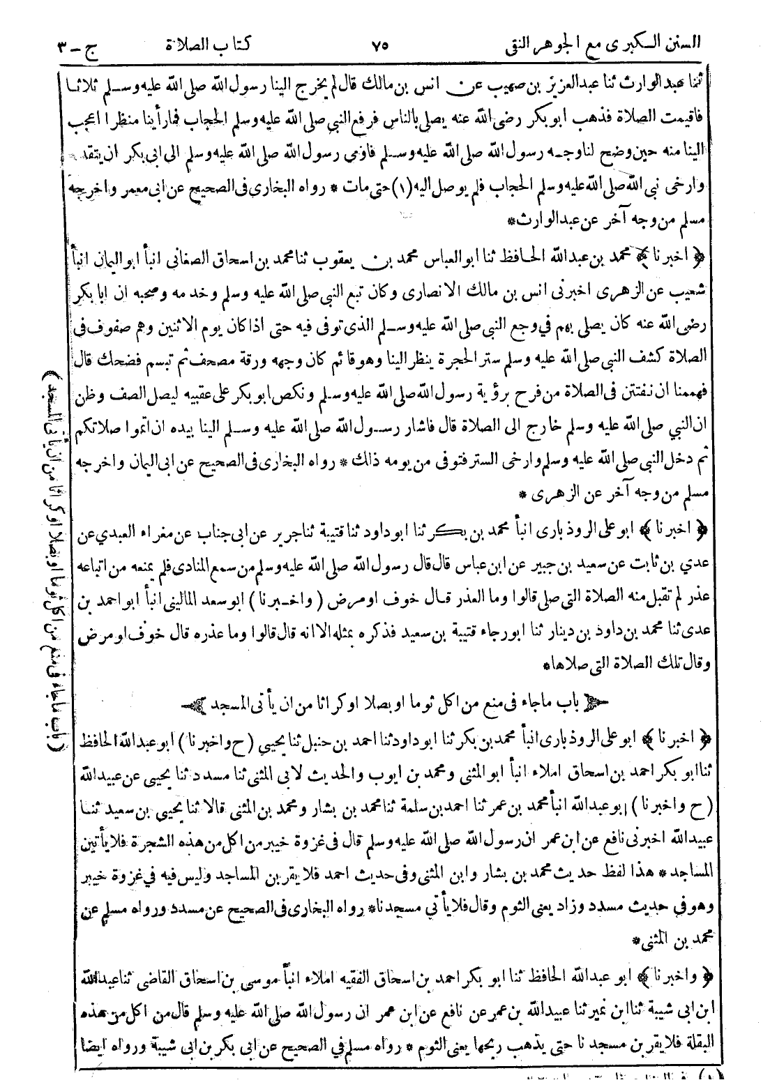 (أخبرنا) محمد بن عبد الله الحافظ ثنا أبو العباس محمد بن يعقوب ثنا محمد بن اسحاق الصغاني انبأ أبو اليمان انبأ شعيب عن الزهري اخبرني انس بن مالك الانصاري وكان تبع النبي صلى الله عليه وسلم وخدمه وصحبه ان ابا بكر رضي الله عنه كان يصلي بهم في وجع النبي صلى الله عليه وسلم الذي توفي فيه حتى إذا كان يوم الاثنين وهم صفوف في الصلاة كشف النبي صلى الله عليه وسلم ستر الحجرة ينظر الينا وهو قائم كأن وجهه ورقة مصحف ثم تبسم فضحك قال فهممنا ان نفتتن في الصلاة من فرح برؤية رسول الله صلى الله عليه وسلم ونكص أبو بكر على عقبيه ليصل الصف وظن ان النبي صلى الله عليه وسلم خارج إلى الصلاة قال فاشار رسول الله صلى الله عليه وسلم الينا بيده ان اتموا صلاتكم ثم دخل النبي صلى الله عليه وسلم وارخى الستر فتوفي من يومه ذلك * رواه البخاري في الصحيح عن ابن اليمان واخرجه مسلم من وجه آخر عن الزهري *