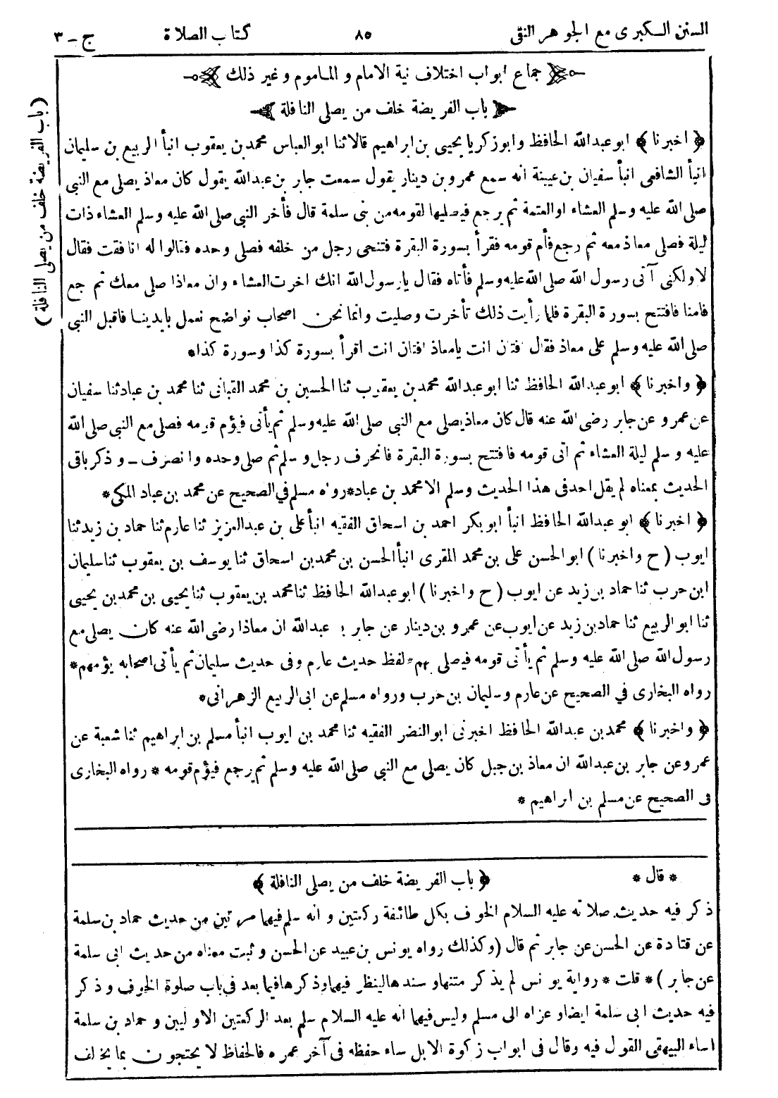 * قال * (باب الفريضة خلف من يصلى النافلة) ذكر فيه حديث صلاته عليه السلام الخوف بكل طائفة ركعتين وانه سلم فيهما مرتين من حديث حماد بن سلمة عن قتادة عن الحسن عن جابر ثم قال (وكذلك رواه يونس بن عبيد عن الحسن وثبت معناه من حديث ابي سلمة عن جابر) * قلت * رواية يونس لم يذكر متنها وسندها لينظر فيهما وذكرها فيما بعد في باب صلوة الخوف وذكر فيه حديث ابي سلمة ايضا وعزاه إلى مسلم وليس فيهما انه عليه السلام سلم بعد الركعتين الاوليين وحماد بن سلمة اساء البيهقي القول فيه وقال في ابواب زكوة الابل ساء حفظه في آخر عمره فالحفاظ لا يحتجون بما يخالف