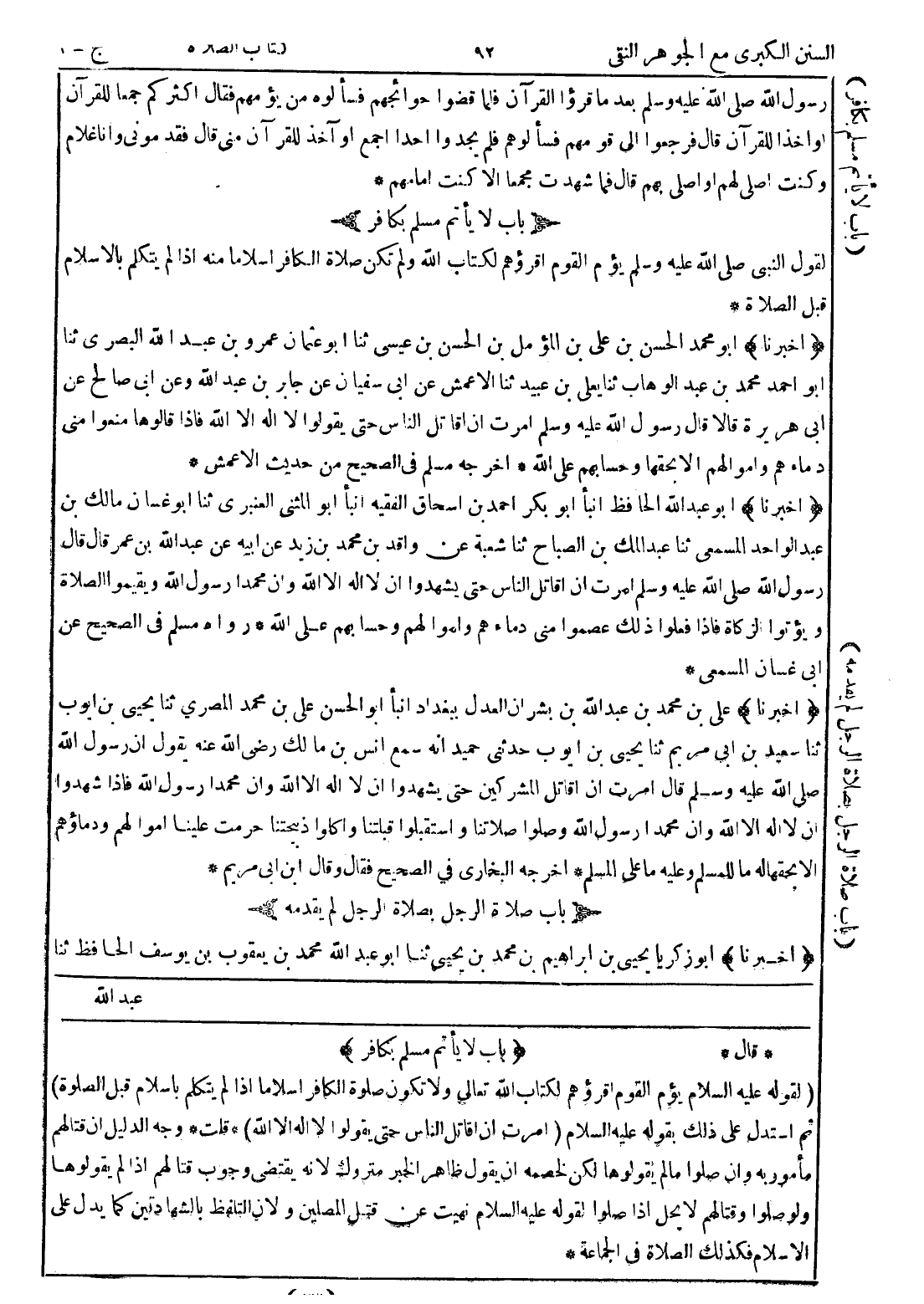 * قال * (باب لا يأتم مسلم بكاف) (لقوله عليه السلام يؤم القوم اقرؤهم لكتاب الله تعالى ولا تكون صلوة الكافر اسلاما إذا لم يتكلم باسلام قبل الصلوة) ثم استدل على ذلك بقوله عليه السلام (امرت ان اقاتل الناس حتى يقولوا لا اله الا الله) * قلت * وجه الدليل ان قتالهم مأمور به وان صلوا ما لم يقولوها لكن لخصمه ان يقول ظاهر الخبر متروك لانه يقتضى وجوب قتالهم إذا لم يقولوها ولو صلوا وقتالهم لا يحل إذا صلوا لقوله عليه السلام نهيت عن قتل المصلين ولان التلفظ بالشهادتين كما يدل على الاسلام فكذلك الصلاة في الجماعة *