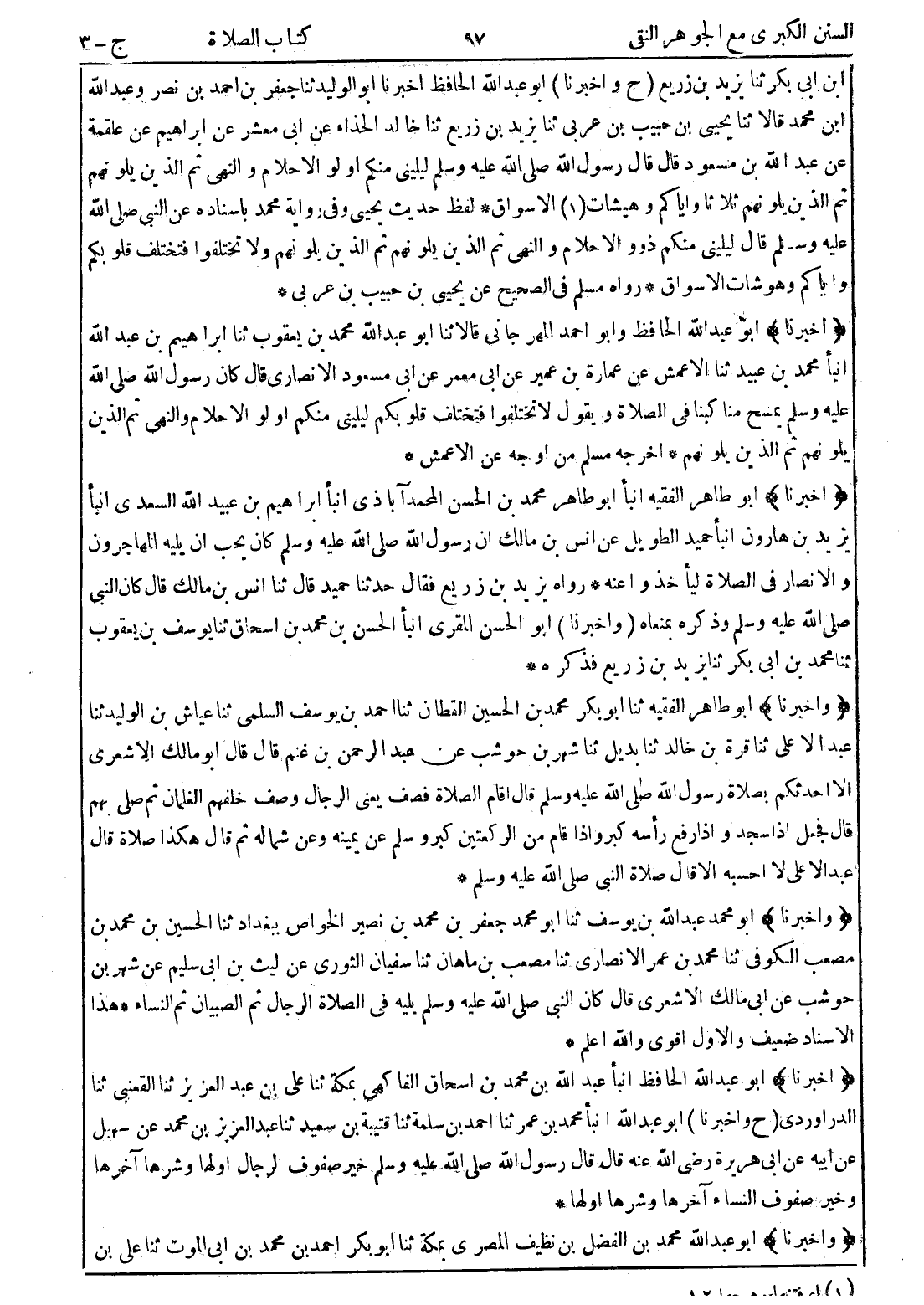 (أخبرنا) أبو عبد الله الحافظ انبأ عبد الله بن محمد بن اسحاق الفاكهي بمكة ثنا علي بن عبد العزيز ثنا القعنبي ثنا الدراوردي (ح واخبرنا) أبو عبد الله انبأ محمد بن عمر ثنا احمد بن سلمة ثنا قتيبة بن سعيد ثنا عبد العزيز بن محمد عن سهيل عن ابيه عن ابي هريرة رضي الله عنه قال قال رسول الله صلى الله عليه وسلم خير صفوف الرجال اولها وشرها آخرها