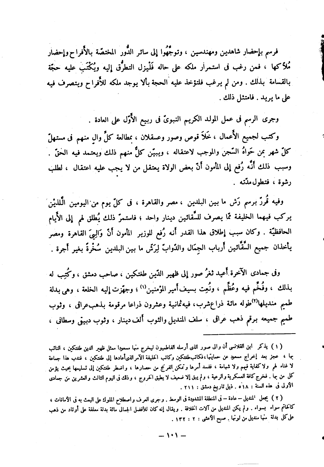 وفيه قرر برسم رش ما بين البلدين، مصر والقاهرة، في كل يوم من اليومين اللذين يركب فيهما الخليفة مما يصرف للسقائين دينار واحد؛ فاستمر ذلك يطلق لهم إلى الأيام الحافظية. وكان سبب إطلاق هذا القدر أنه رفع للوزير المأمون أن واليي القاهرة ومصر يأخذان جميع السقائين أرباب الجمال والدواب لرش ما بين البلدين سخرةً بغير أجرة.