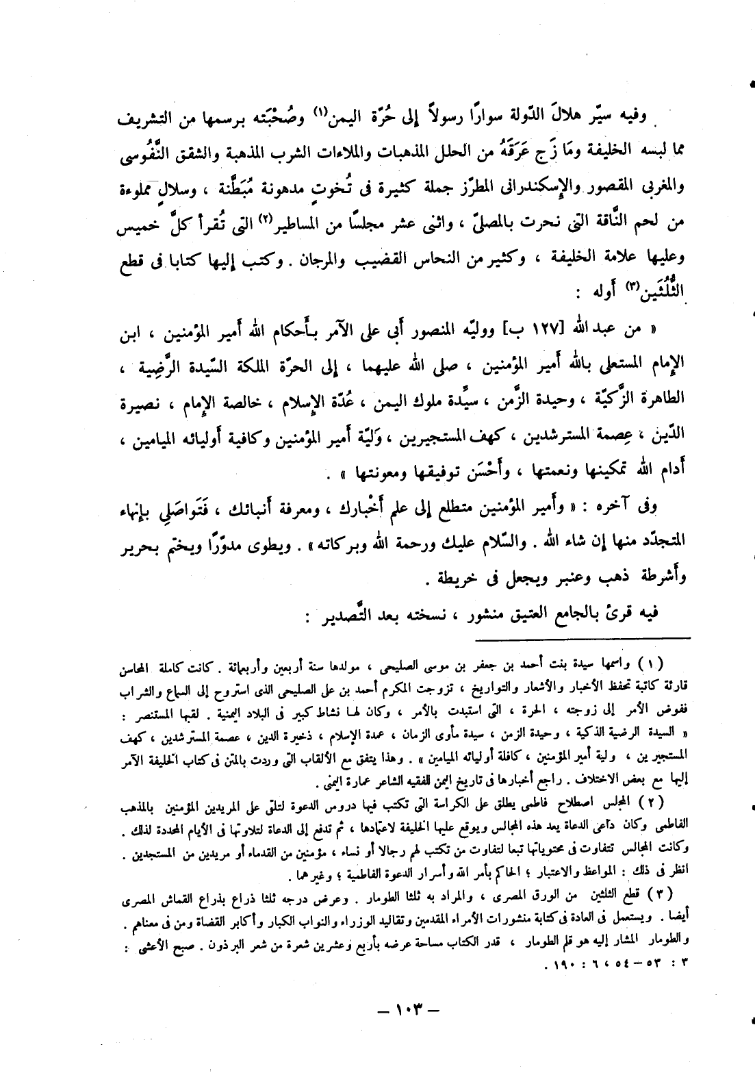وفيه سير هلال الدولة سواراً رسولاً إلى حرة اليمن وصحبته برسمها من التشريف مما لبسه الخليفة وما زج عرقه من الحلل المذهبات والملاءات الشرب المذهبة والشقق النفوسى والمغربي المقصور والإسكندراني المطرز جملة كثيرة في تخوت مدهونة مبطنة، وسلال مملوءة من لحم الناقة التي نحرت بالمصلى، واثنى عشر مجلساً من المساطير التي تقرأ كل خميس وعليها علامة الخليفة، وكثير من النحاس القضيب والمرجان. وكتب إليها كتابا في قطع الثلثين أوله: من عبد الله ووليه المنصور أبي علي الآمر بأحكام الله أمير المؤمنين، ابن الإمام المستعلى بالله أمير المؤمنين، صلى الله عليهما، إلى الحرة الملكة السيدة الرضية، الطاهرة الزكية، وحيدة الزمن، سيدة ملوك اليمن، عدة الإسلام، خالصة الإمام، نصيرة الدين، عصمة المسترشدين، كهف المستجيرين، ولية أمير المؤمنين وكافية أوليائه الميامين، أدام الله تمكينها ونعمتها، وأحسن توفيقها ومعونتها.
