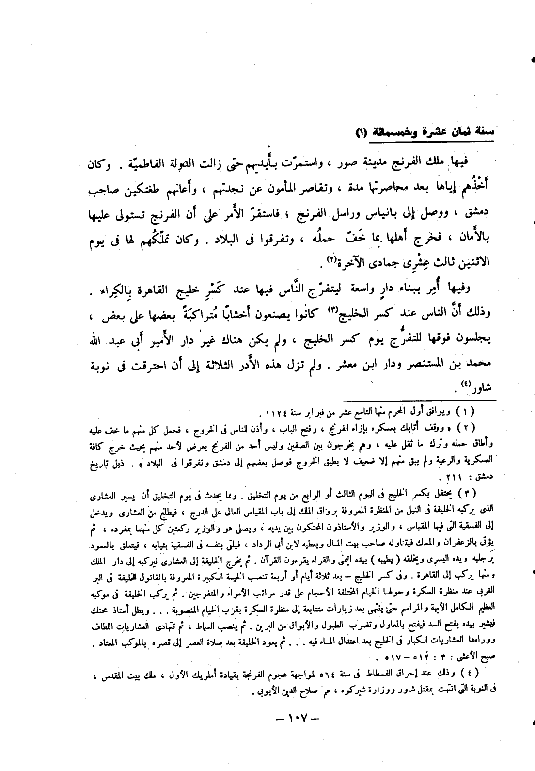 فيها ملك الفرنج مدينة صور، واستمرت بأيديهم حتى زالت الدولة الفاطمية. وكان أخذهم إياها بعد محاصرتها مدة، وتقاصر المأمون عن نجدتهم، وأعانهم طغتكين صاحب دمشق، ووصل إلى بانياس وراسل الفرنج؛ فاستقر الأمر على أن الفرنج تستولي عليها بالأمان، فخرج أهلها بما خف حمله، وتفرقوا في البلاد. وكان تملكهم لها في يوم الاثنين ثالث عشري جمادى الآخرة.