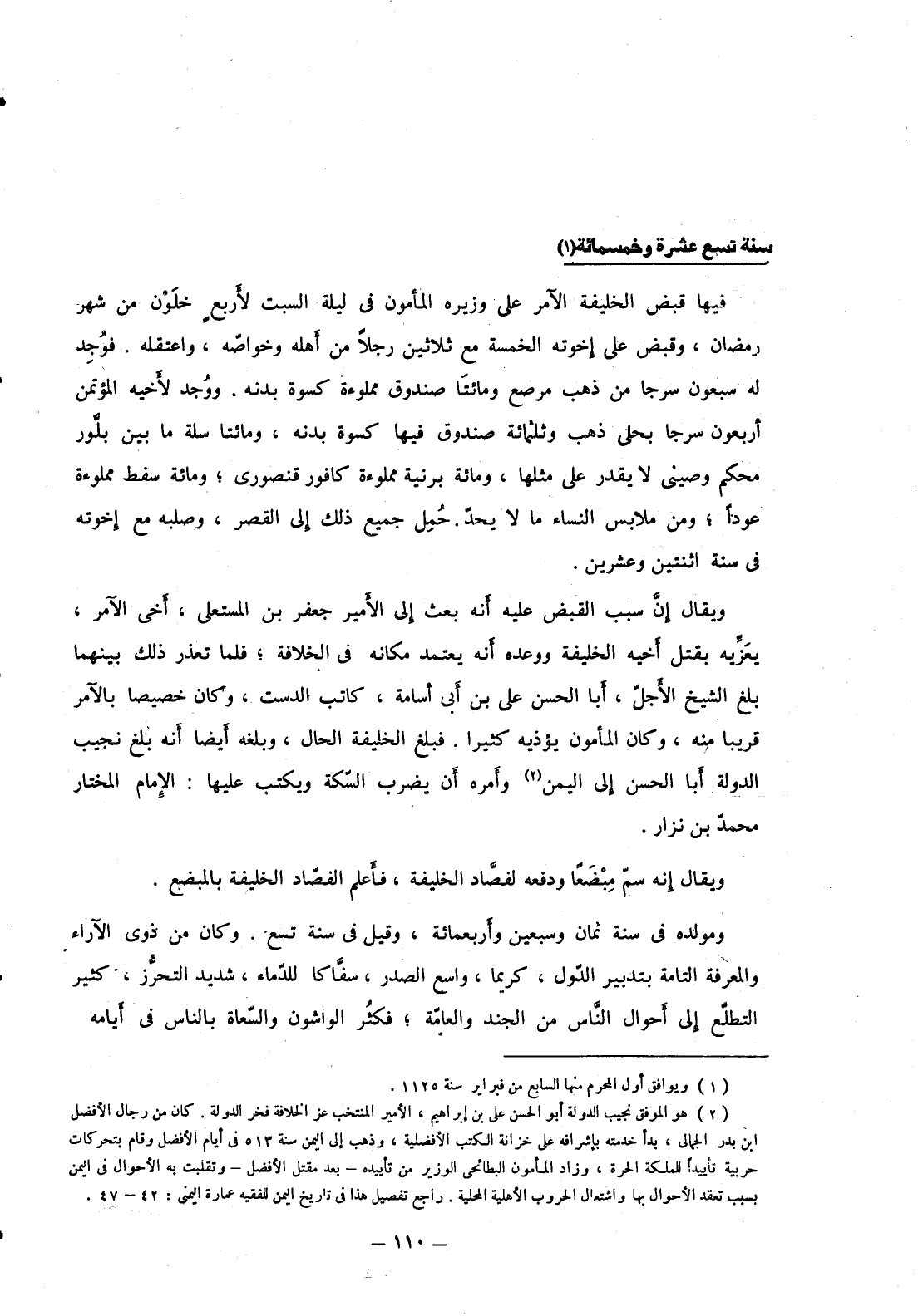 فيها قبض الخليفة الآمر على وزيره المأمون في ليلة السبت لأربع خلون من شهر رمضان، وقبض على إخوته الخمسة مع ثلاثين رجلاً من أهله وخواصه، واعتقله. فوجد له سبعون سرجا من ذهب مرضع ومائتا صندوق مملوءة كسوة بدنه. ووجد لأخيه المؤتمن أربعون سرجا بحلى ذهب وثلثمائة صندوق فيها كسوة بدنه، ومائتا سلة ما بين بلور محكم وصيني لا يقدر على مثلها، ومائة برنية مملوءة كافور قنصوري؛ ومائة سفط مملوءة عوداً؛ ومن ملابس النساء ما لا يحد. حمل جميع ذلك إلى القصر، وصلبه مع إخوته في سنة اثنتين وعشرين.