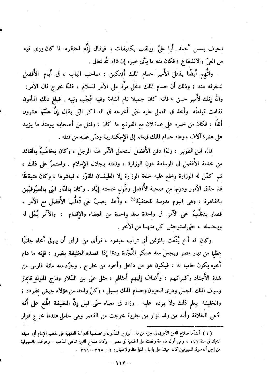 قال ابن الطوير: ولما دفن الأفضل استعمل الآمر هذا الرجل، وكان يخاطب بالقائد من خدمة الأفضل في الوساطة دون الوزارة، ونعته بجلال الإسلام. واستمر على ذلك، ثم كمل له الوزارة وخلع عليه خلعة الوزارة إلا الطيلسان المقور، فباشرها، وكان متيقظاً قد حذق الأمور ودربها من صحبة الأفضل وطول خدمته إياه. وكان بالدار التي بالسيوفيين بالقاهرة، وهي اليوم مدرسة للحنفية، وأخذ يصب على تغلب الأفضل مع الآمر، فصار يتغلب على الآمر في واحدة بعد واحدة من الجفاء والإقدام، والآمر يملى له ويحتمله، حتى استوحش كل منهما من الآخر.