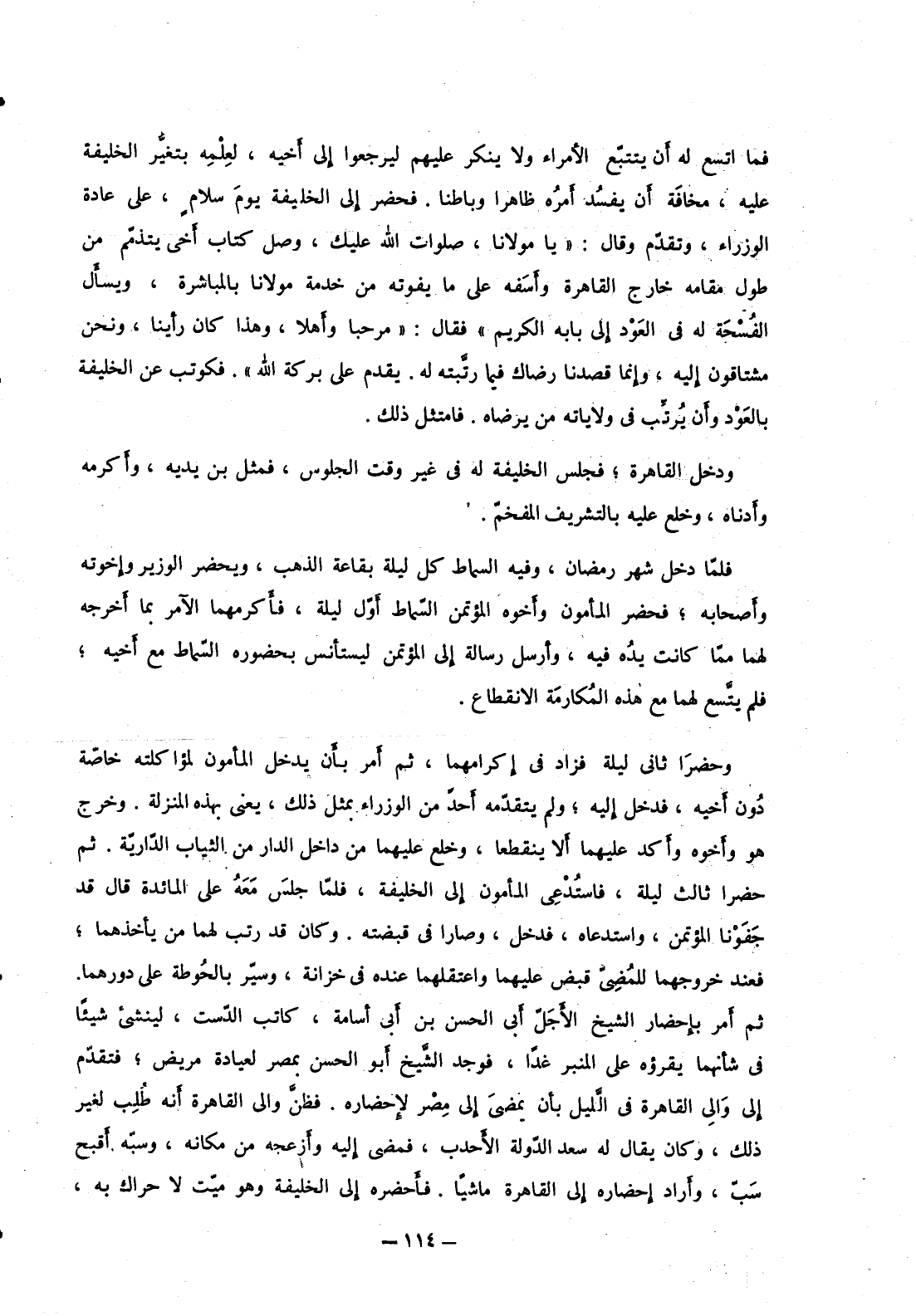 فما اتسع له أن يتتبع الأمراء ولا ينكر عليهم ليرجعوا إلى أخيه، لعلمه بتغير الخليفة عليه، مخافة أن يفسد أمره ظاهرا وباطنا. فحضر إلى الخليفة يوم سلام، على عادة الوزراء، وتقدم وقال: يا مولانا، صلوات الله عليك، وصل كتاب أخي يتذمم من طول مقامه خارج القاهرة وأسفه على ما يفوته من خدمة مولانا بالمباشرة، ويسأل الفسحة له في العودة إلى بابه الكريم فقال: مرحبا وأهلا، وهذا كان رأينا، ونحن مشتاقون إليه، وإنما قصدنا رضاك فيما رتبته له. يقدم على بركة الله. فكوتب عن الخليفة بالعود وأن يرتب في ولاياته من يرضاه. فامتثل ذلك.