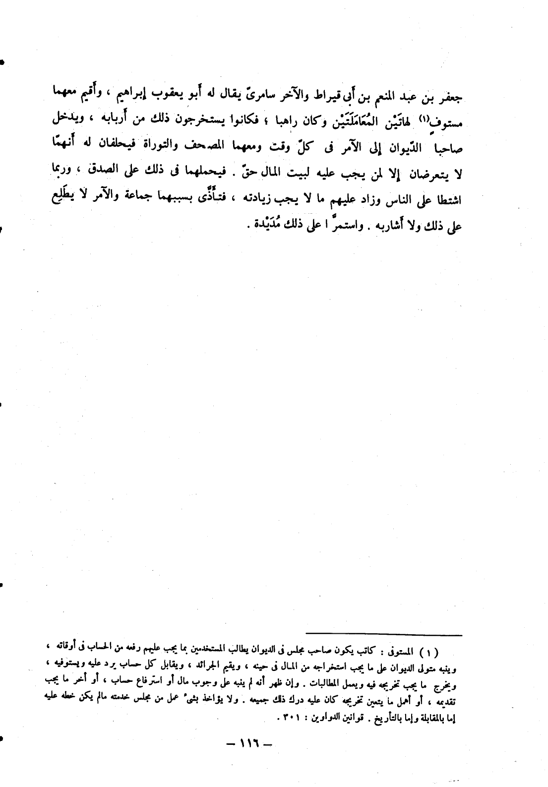 جعفر بن عبد المنعم بن أبي قيراط والآخر سامري يقال له أبو يعقوب إبراهيم، وأقيم معهما مستوف لهاتين المعاملتين وكان راهبا؛ فكانوا يستخرجون ذلك من أربابه، ويدخل صاحبا الديوان إلى الآمر في كل وقت ومعهما المصحف والتوراة فيحلفان له أنهما لا يتعرضان إلا لمن يجب عليه لبيت المال حق. فيحملها في ذلك على الصدق، وربما اشتطا على الناس وزاد عليهم ما لا يجب زيادته، فتأذى بسببهما جماعة والآمر لا يطلع على ذلك ولا أشاربه. واستمرا على ذلك مديدة.