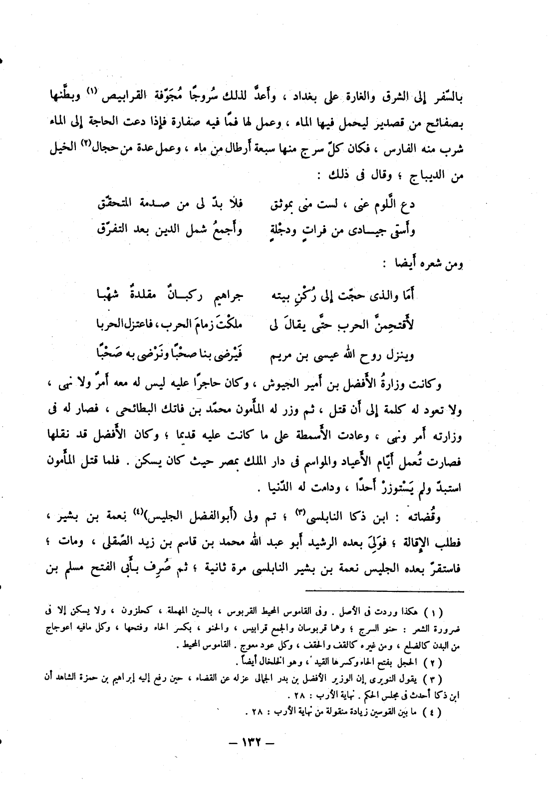 بالسفر إلى الشرق والغارة على بغداد، وأعد لذلك سروجاً مجوفة القرابيص وبطنها بصفائح من قصدير ليحمل فيها الماء، وعمل لها فماً فيه صفارة فإذا دعت الحاجة إلى الماء شرب منه الفارس، فكان كل سرج منها سبعة أرطال من ماء، وعمل عدة من حجال الخيل من الديباج؛ وقال في ذلك: