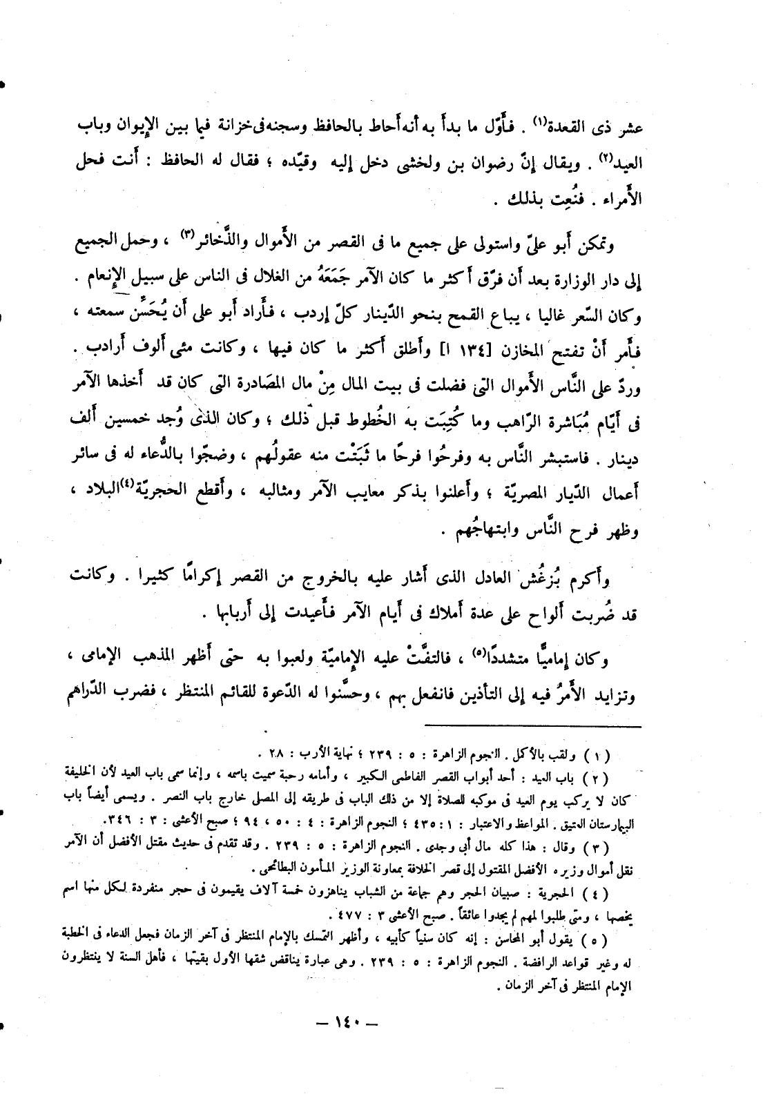 عشر ذي القعدة. فأول ما بدأ به أنه أحاط بالحافظ وسجنه في خزانة فيما بين الإيوان وباب العيد. ويقال إن رضوان بن ولخشي دخل إليه وقيده؛ فقال له الحافظ: أنت فحل الأمراء. فنعت بذلك.