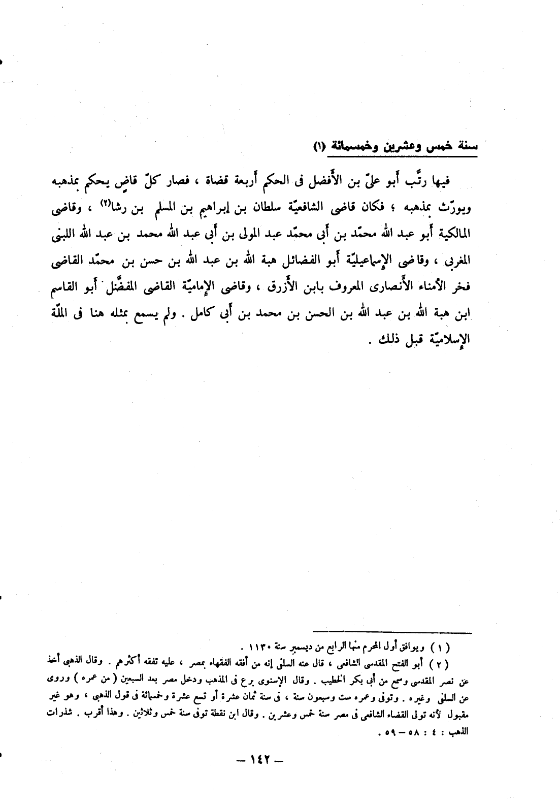 فيها رتب أبو علي بن الأفضل في الحكم أربعة قضاة، فصار كل قاض يحكم بمذهبه ويورث بمذهبه؛ فكان قاضي الشافعية سلطان بن إبراهيم بن المسلم بن رشا، وقاضي المالكية أبو عبد الله محمد بن أبي محمد عبد المولى بن أبي عبد الله محمد بن عبد الله اللبني المغربي، وقاضي الإسماعيلية أبو الفضائل هبة الله بن عبد الله بن حسن بن محمد القاضي فخر الأمناء الأنصاري المعروف بابن الأزرق، وقاضي الإمامية القاضي المفضل أبو القاسم ابن هبة الله بن عبد الله بن الحسن بن محمد بن أبي كامل. ولم يسمع بمثله هنا في الملة الإسلامية قبل ذلك.