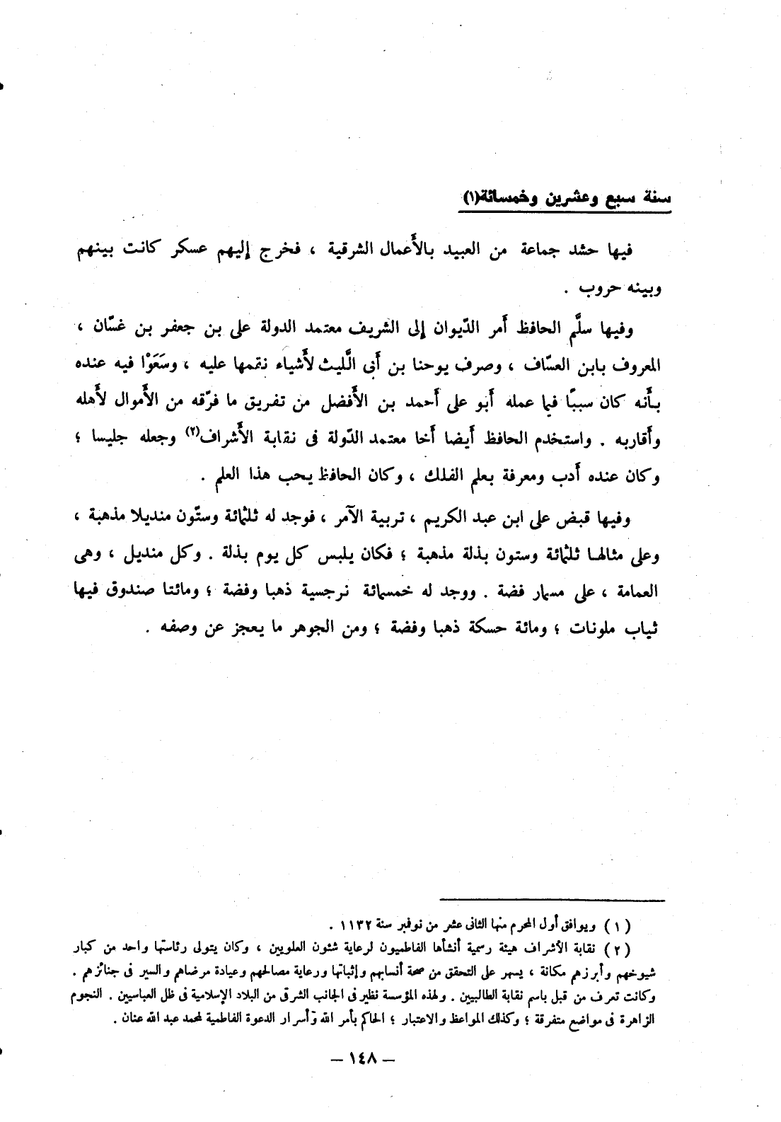 وفيها قبض على ابن عبد الكريم، تربية الآمر، فوجد له ثلثمائة وستون منديلا مذهبة، وعلى مثالها ثلثمائة وستون بذلة مذهبة؛ فكان يلبس كل يوم بذلة. وكل منديل، وهي العمامة، على مسمار فضة. ووجد له خمسمائة نرجسية ذهبا وفضة؛ ومائتا صندوق فيها ثياب ملونات؛ ومائة حسكة ذهبا وفضة؛ ومن الجوهر ما يعجز عن وصفه.