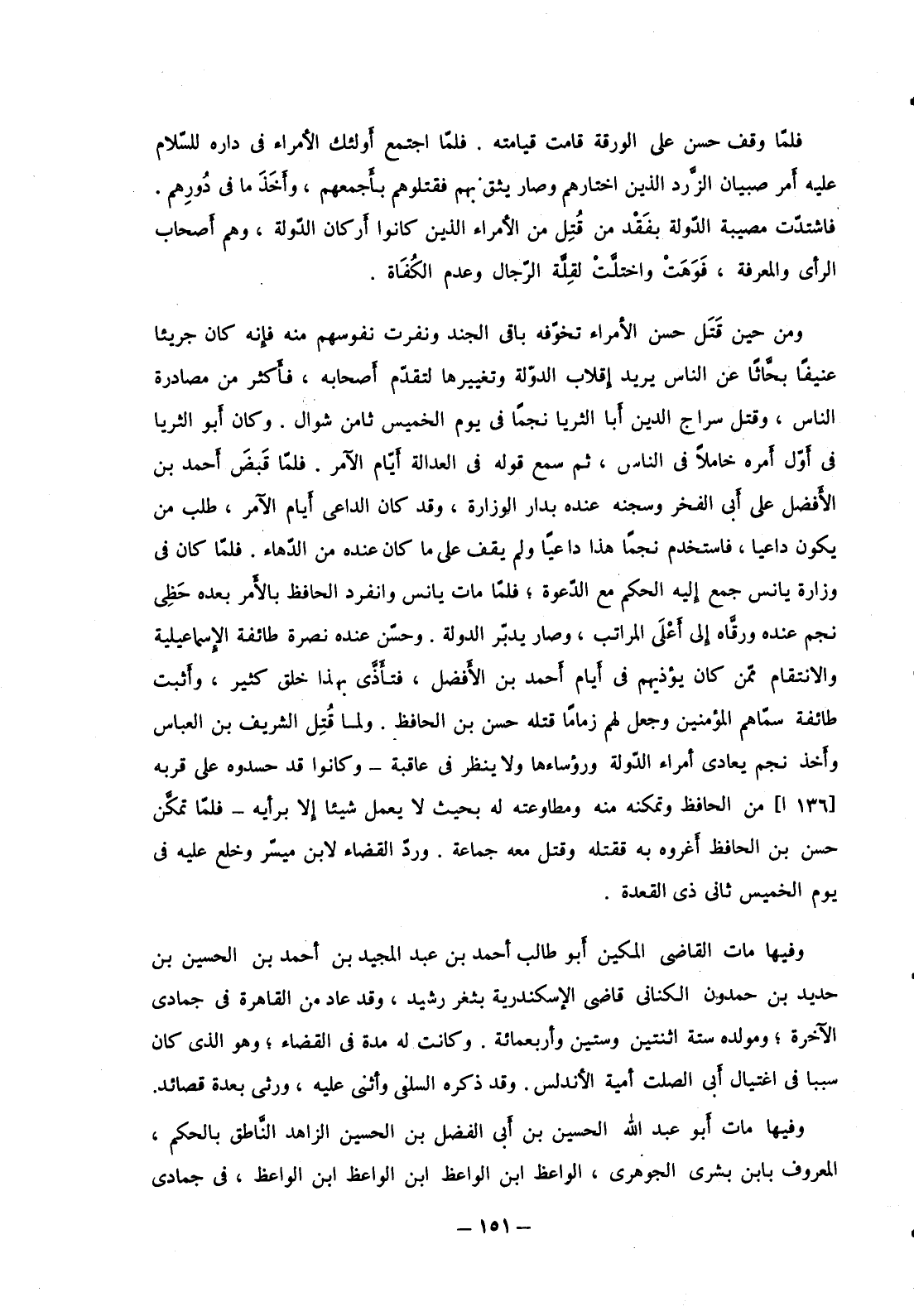 فلما وقف حسن على الورقة قامت قيامته. فلما اجتمع أولئك الأمراء في داره للسلام عليه أمر صبيان الزرد الذين اختارهم وصار يثق بهم فقتلوهم بأجمعهم، وأخذ ما في دورهم. فاشتدت مصيبة الدولة بفقد من قتل من الأمراء الذين كانوا أركان الدولة، وهم أصحاب الرأي والمعرفة، فوهت واختلت لقلة الرجال وعدم الكفاة.