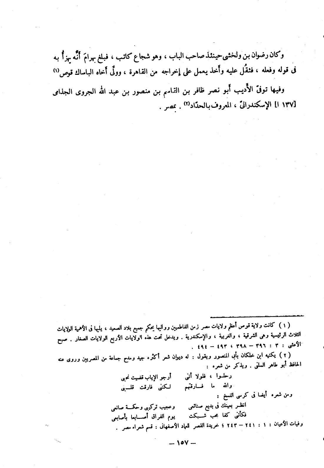 وكان رضوان بن ولخشى حينئذ صاحب الباب، وهو شجاع كاتب، فبلغ بهرام أنه يهزأ به في قوله وفعله، فثقل عليه وأخذ يعمل على إخراجه من القاهرة، وولى أخاه الباساك قوص وفيها توفى الأديب أبو نصر ظافر بن القاسم بن منصور بن عبد الله الجروي الجذامي الإسكندراني، المعروف بالحداد. بمصر.