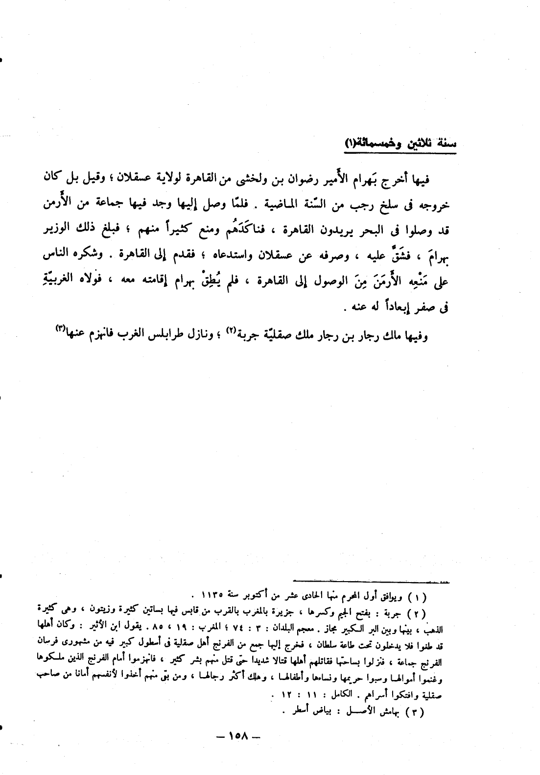 فيها أخرج بهرام الأمير رضوان بن ولخشى من القاهرة لولاية عسقلان؛ وقيل بل كان خروجه في سلخ رجب من السنة الماضية. فلما وصل إليها وجد فيها جماعة من الأرمن قد وصلوا في البحر يريدون القاهرة، فناكدهم ومنع كثيراً منهم؛ فبلغ ذلك الوزير بهرام، فشق عليه، وصرفه عن عسقلان واستدعاه؛ فقدم إلى القاهرة. وشكره الناس على منعه الأرمن من الوصول إلى القاهرة، فلم يطق بهرام إقامته معه، فولاه الغربية في صفر إبعاداً له عنه.
