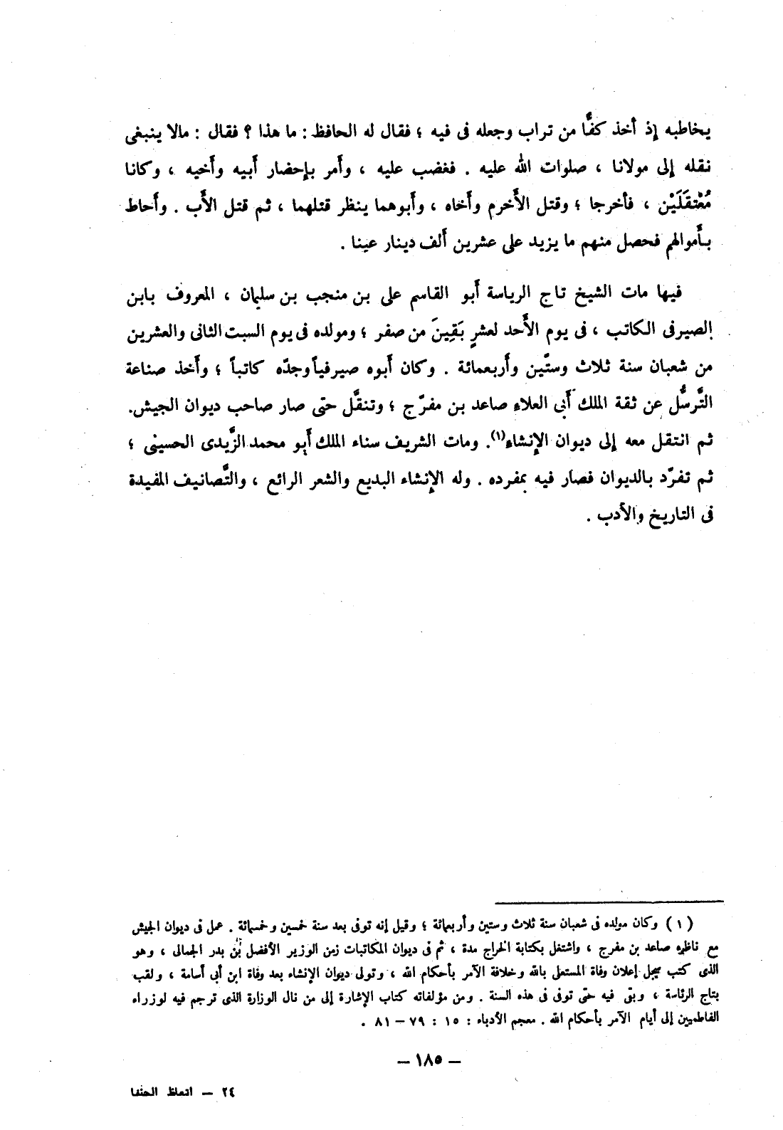 فيها مات الشيخ تاج الرياسة أبو القاسم على بن منجب بن سليمان، المعروف بابن الصيرفي الكاتب، في يوم الأحد لعشر بقين من صفر؛ ومولده في يوم السبت الثاني والعشرين من شعبان سنة ثلاث وستين وأربعمائة. وكان أبوه صيرفياً وجده كاتباً؛ وأخذ صناعة الترسل عن ثقة الملك أبي العلاء صاعد بن مفرج؛ وتنقل حتى صار صاحب ديوان الجيش. ثم انتقل معه إلى ديوان الإنشاء. ومات الشريف سناء الملك أبو محمد الزيدي الحسيني؛ ثم تفرد بالديوان فصار فيه بمفرده. وله الإنشاء البديع والشعر الرائع، والتصانيف المفيدة في التاريخ والأدب.
